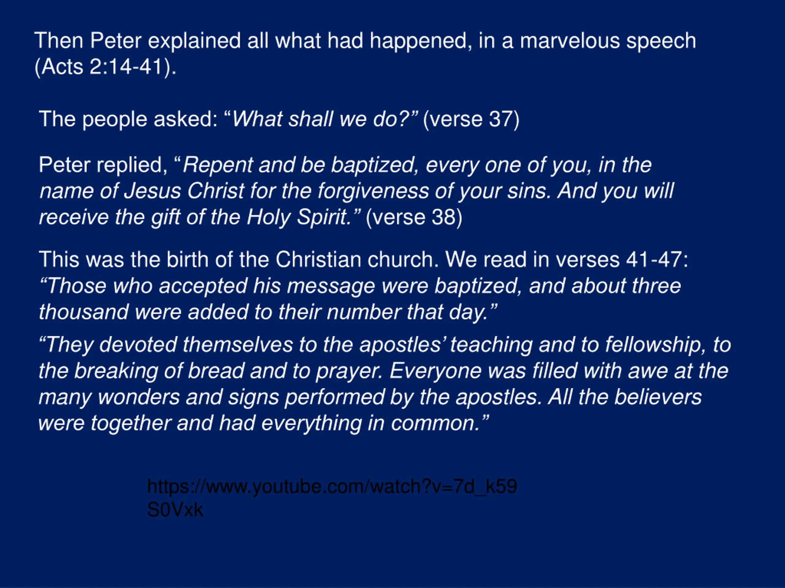 Then Peter explained all what had happened, in a marvelous speech (Acts 2:14-41). The people asked: What shall we do? (verse 37) Peter replied, Repent and be baptized, every one of you, in the name of Jesus Christ for the forgiveness of your sins. And you will receive the gift of the Holy Spirit. (verse 38) This was the birth of the Christian church. We read in verses 41-47: Those who accepted his message were baptized, and about three thousand were added to their number that day. They devoted themselves to the apostles teaching and to fellowship, to the breaking of bread and to prayer. Everyone was filled with awe at the many wonders and signs performed by the apostles. All the believers were together and had everything in common. https://www.youtube.com/watch?v=7d_k59 S0Vxk