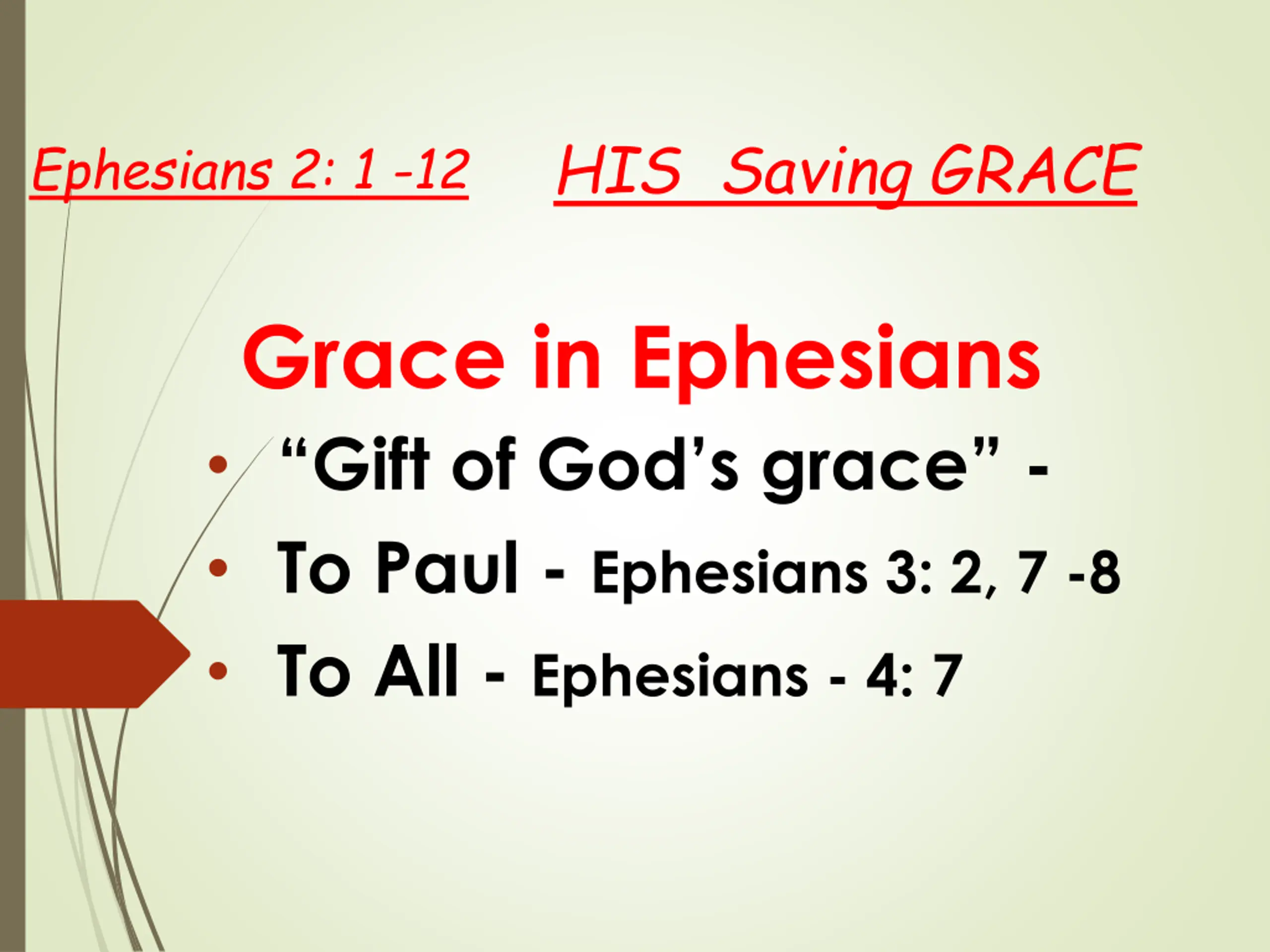 HIS Saving GRACE Ephesians 2: 1 -12 Grace in Ephesians Gift of God s grace - To Paul - Ephesians 3: 2, 7 -8 To All - Ephesians - 4: 7