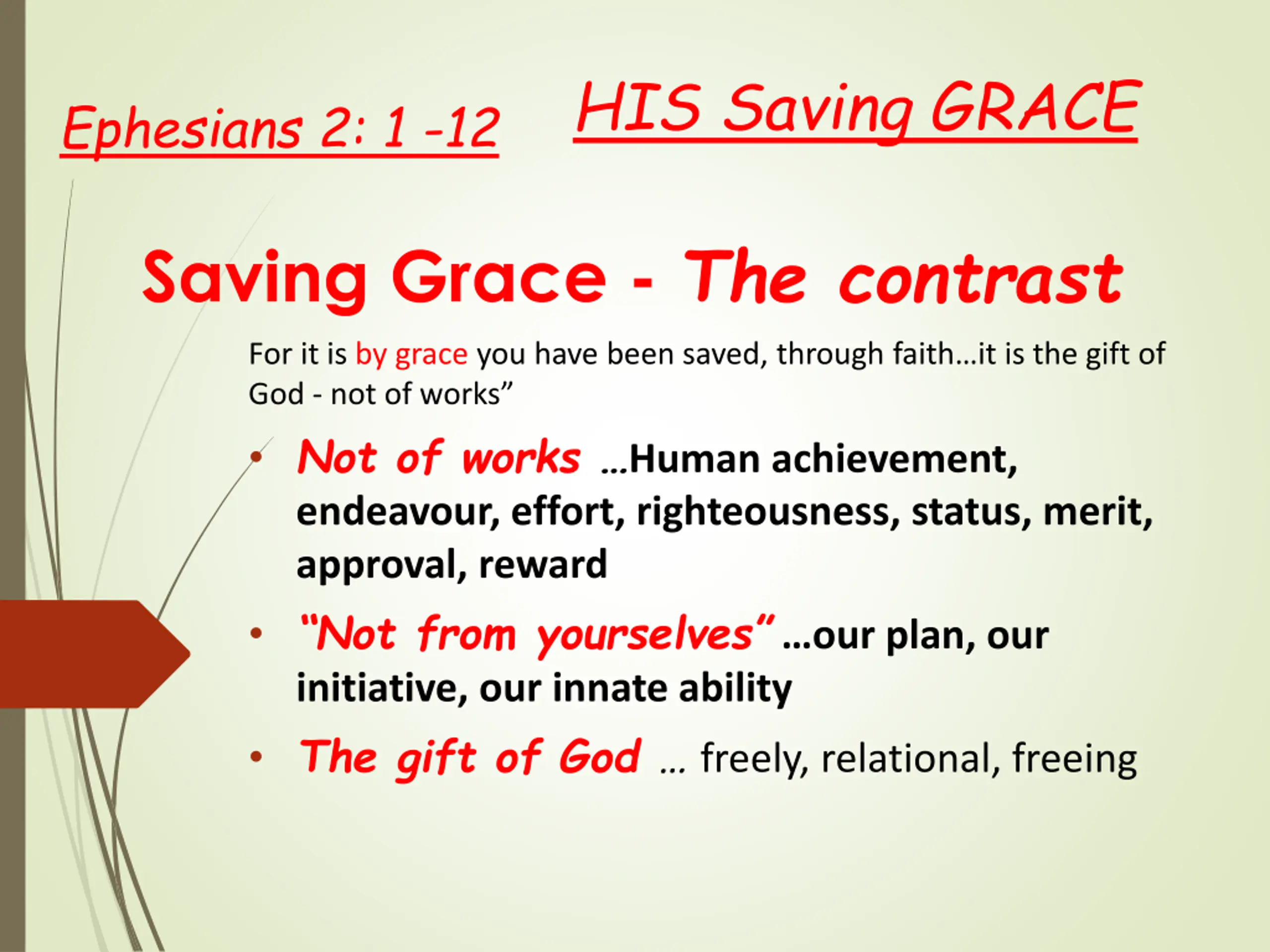 HIS Saving GRACE Ephesians 2: 1 -12 Saving Grace - The contrast For it is by grace you have been saved, through faith it is the gift of God - not of works Not of works Human achievement, endeavour, effort, righteousness, status, merit, approval, reward Not from yourselves our plan, our initiative, our innate ability The gift of God freely, relational, freeing