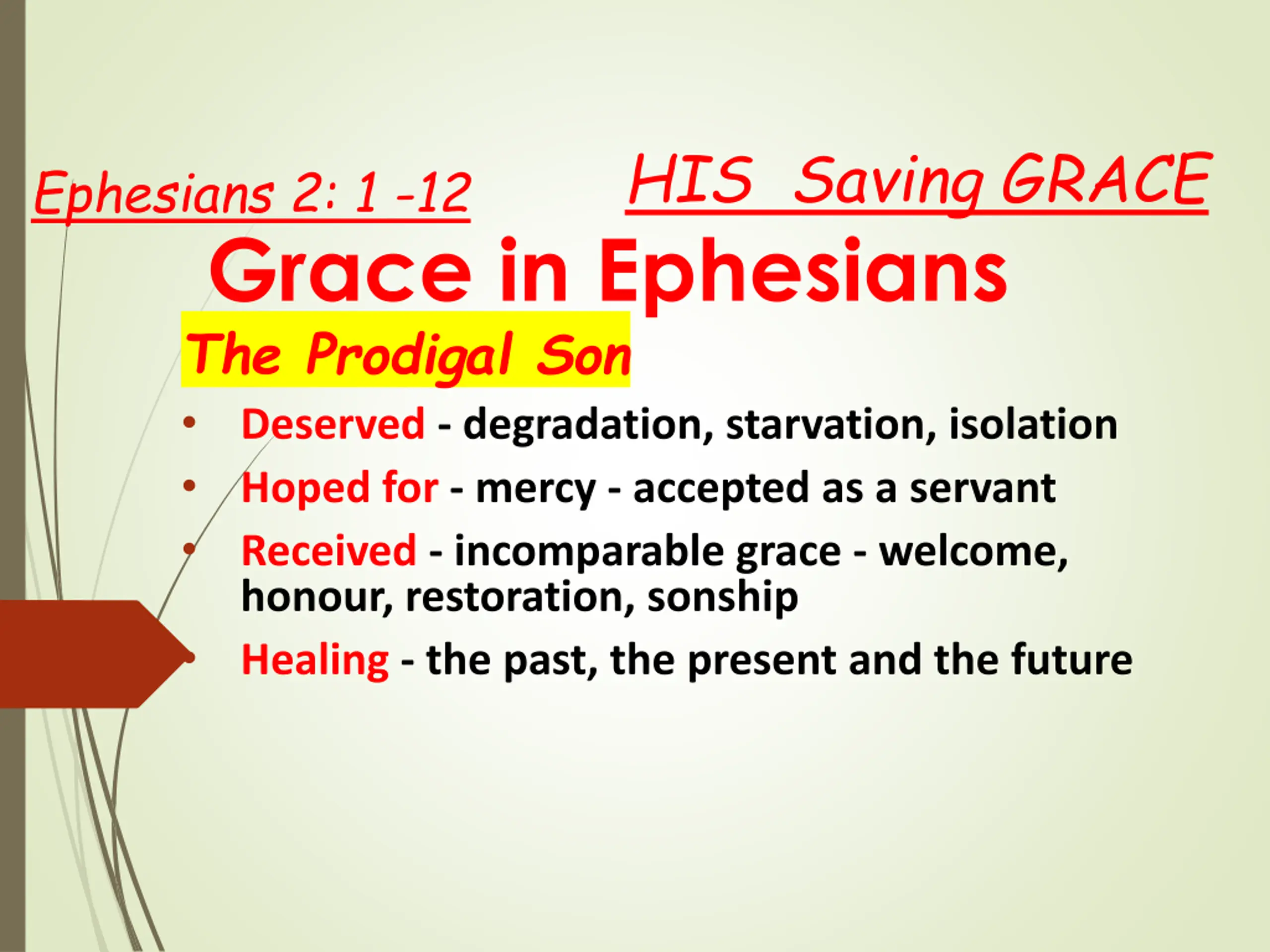 HIS Saving GRACE Ephesians 2: 1 -12 Grace in Ephesians The Prodigal Son Deserved - degradation, starvation, isolation Hoped for - mercy - accepted as a servant Received - incomparable grace - welcome, honour, restoration, sonship Healing - the past, the present and the future