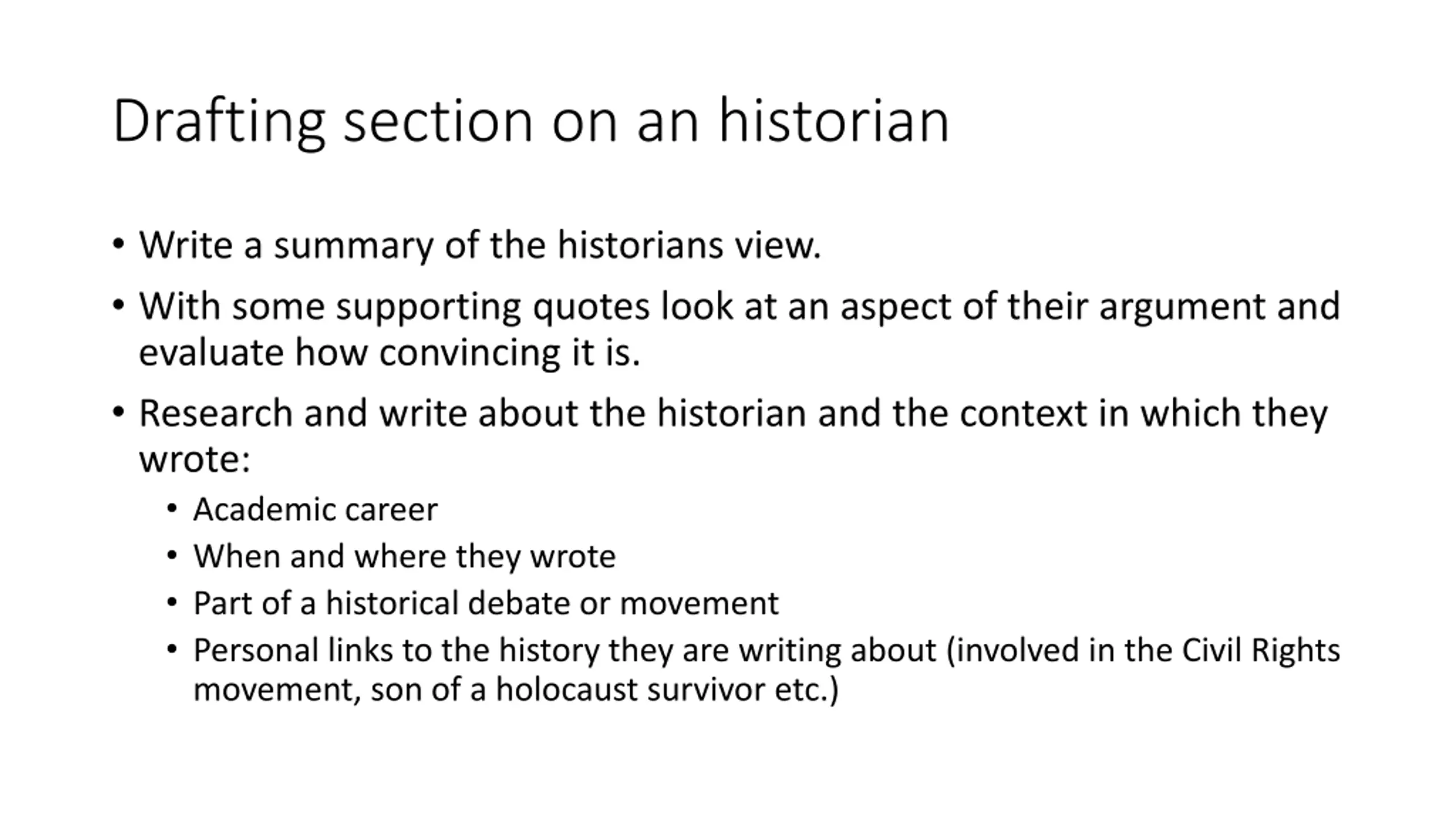 Drafting section on an historian Write a summary of the historians view. With some supporting quotes look at an aspect of their argument and evaluate how convincing it is. Research and write about the historian and the context in which they wrote: Academic career When and where they wrote Part of a historical debate or movement Personal links to the history they are writing about (involved in the Civil Rights movement, son of a holocaust survivor etc.)