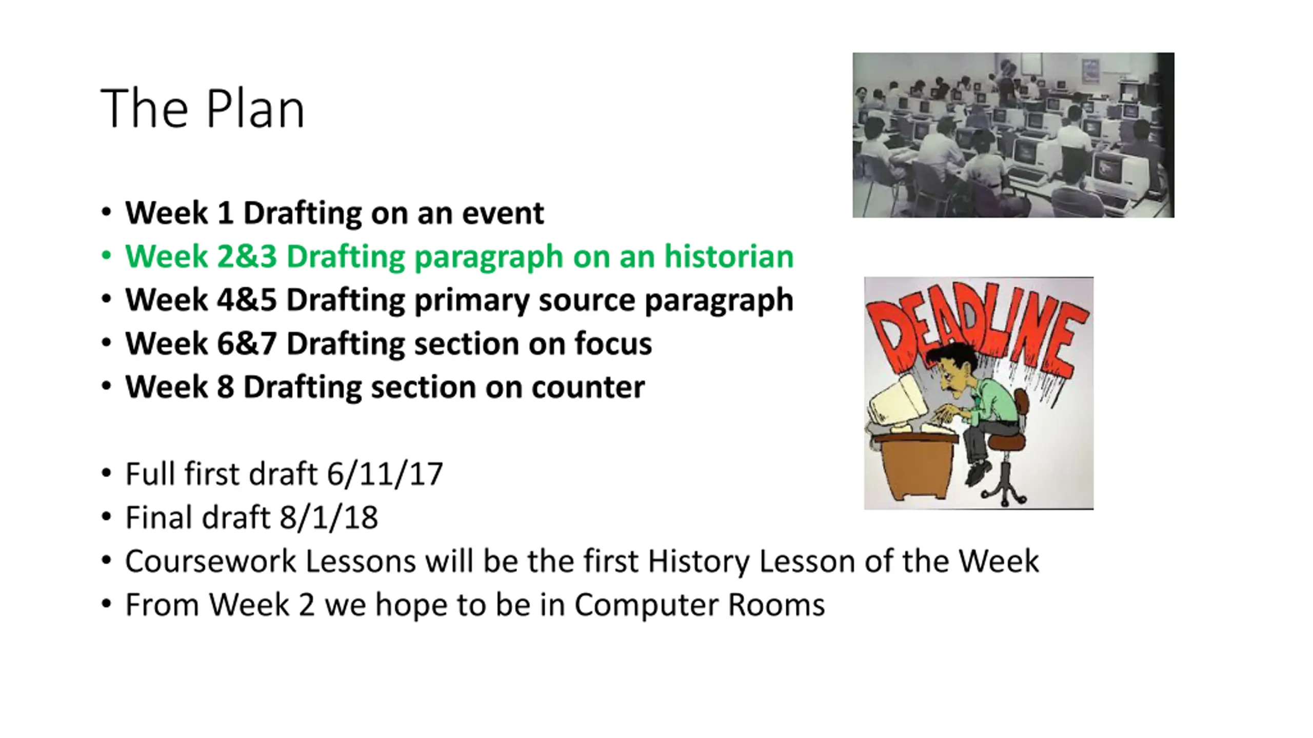 The Plan Week 1 Drafting on an event Week 2&3 Drafting paragraph on an historian Week 4&5 Drafting primary source paragraph Week 6&7 Drafting section on focus Week 8 Drafting section on counter Full first draft 6/11/17 Final draft 8/1/18 Coursework Lessons will be the first History Lesson of the Week From Week 2 we hope to be in Computer Rooms