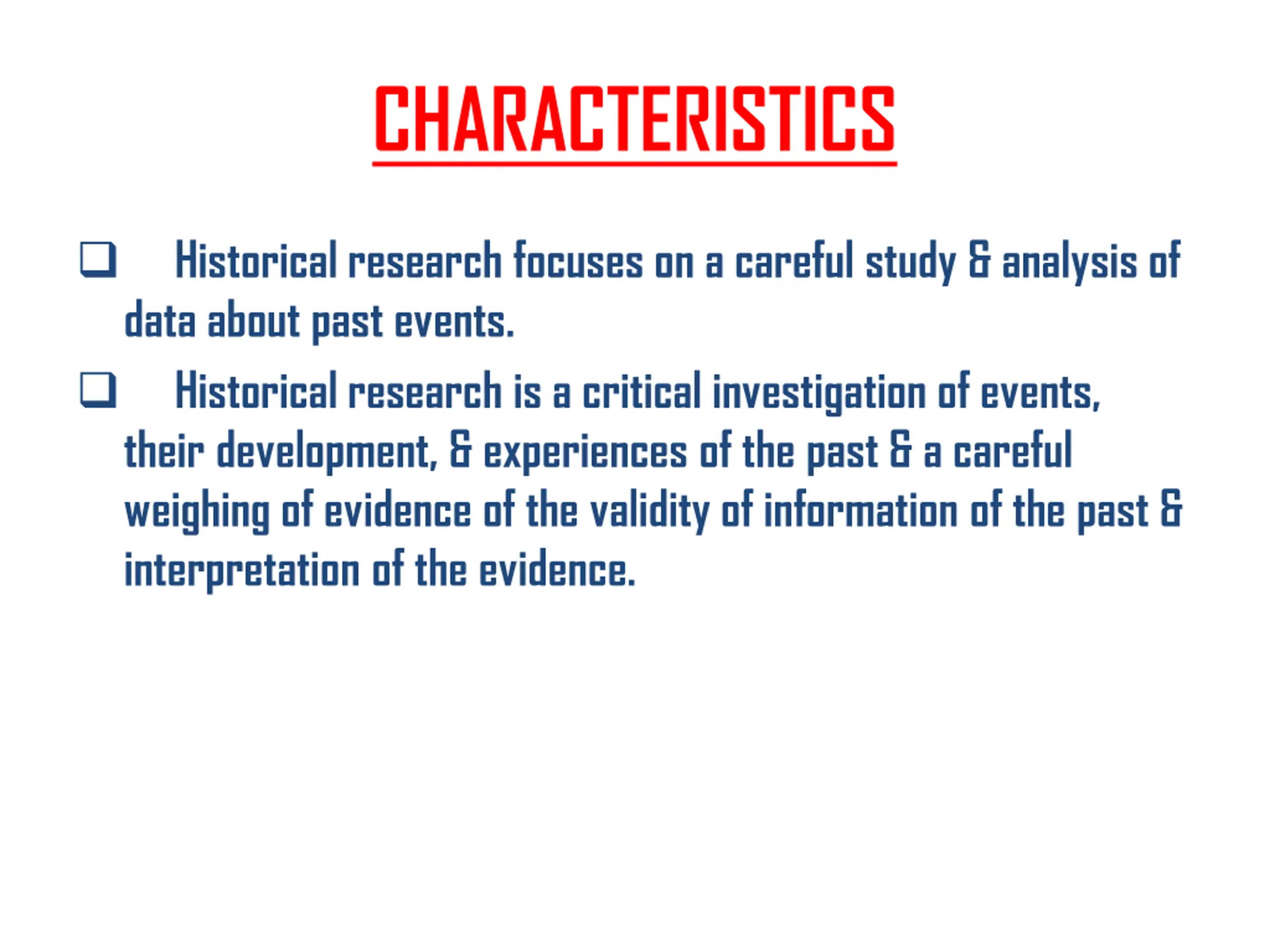 CHARACTERISTICS Historical research focuses on a careful study & analysis of data about past events. Historical research is a critical investigation of events, their development, & experiences of the past & a careful weighing of evidence of the validity of information of the past & interpretation of the evidence.