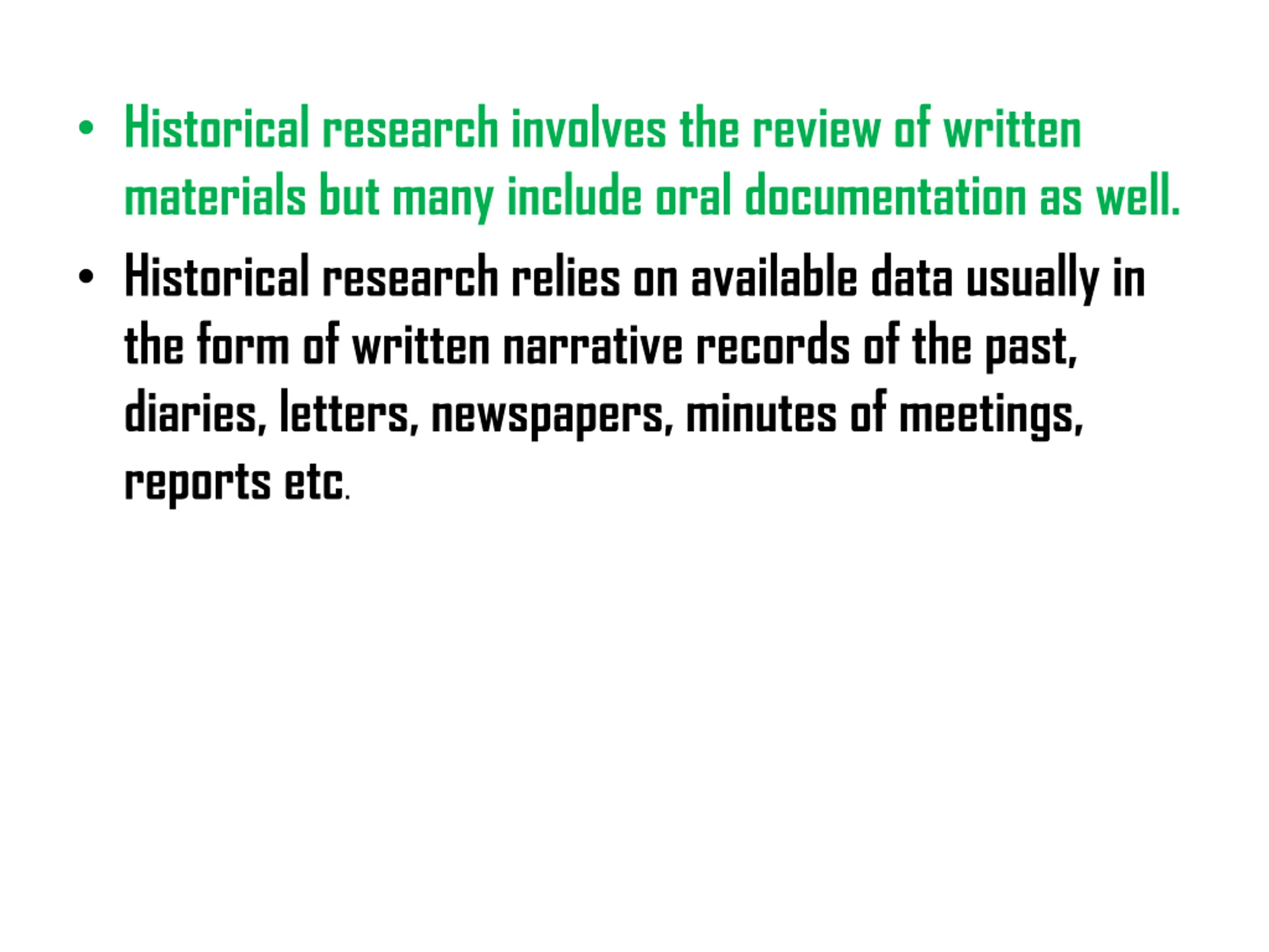 Historical research involves the review of written materials but many include oral documentation as well. Historical research relies on available data usually in the form of written narrative records of the past, diaries, letters, newspapers, minutes of meetings, reports etc.
