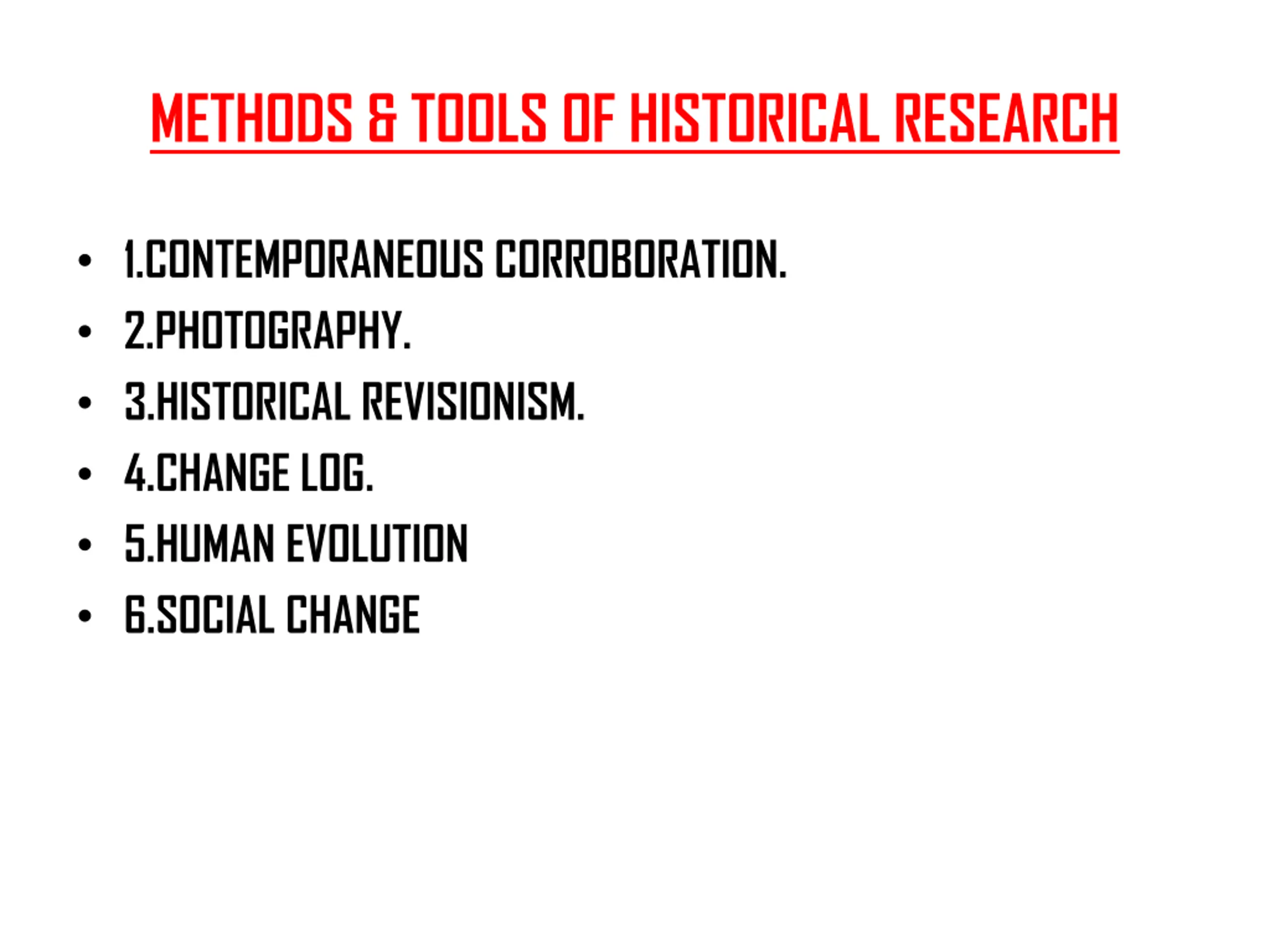 METHODS & TOOLS OF HISTORICAL RESEARCH 1.CONTEMPORANEOUS CORROBORATION. 2.PHOTOGRAPHY. 3.HISTORICAL REVISIONISM. 4.CHANGE LOG. 5.HUMAN EVOLUTION 6.SOCIAL CHANGE