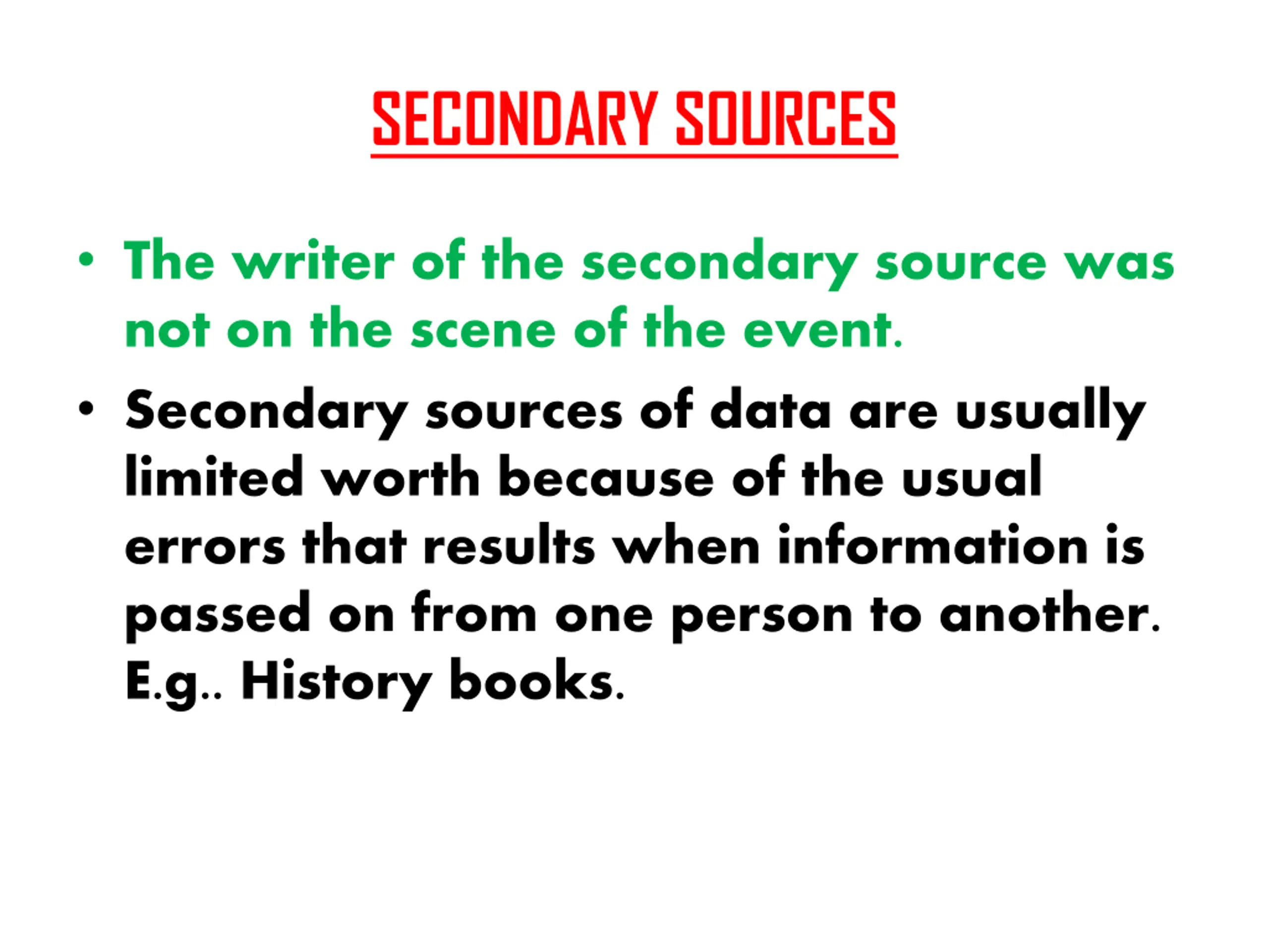 SECONDARY SOURCES The writer of the secondary source was not on the scene of the event. Secondary sources of data are usually limited worth because of the usual errors that results when information is passed on from one person to another. E.g.. History books.