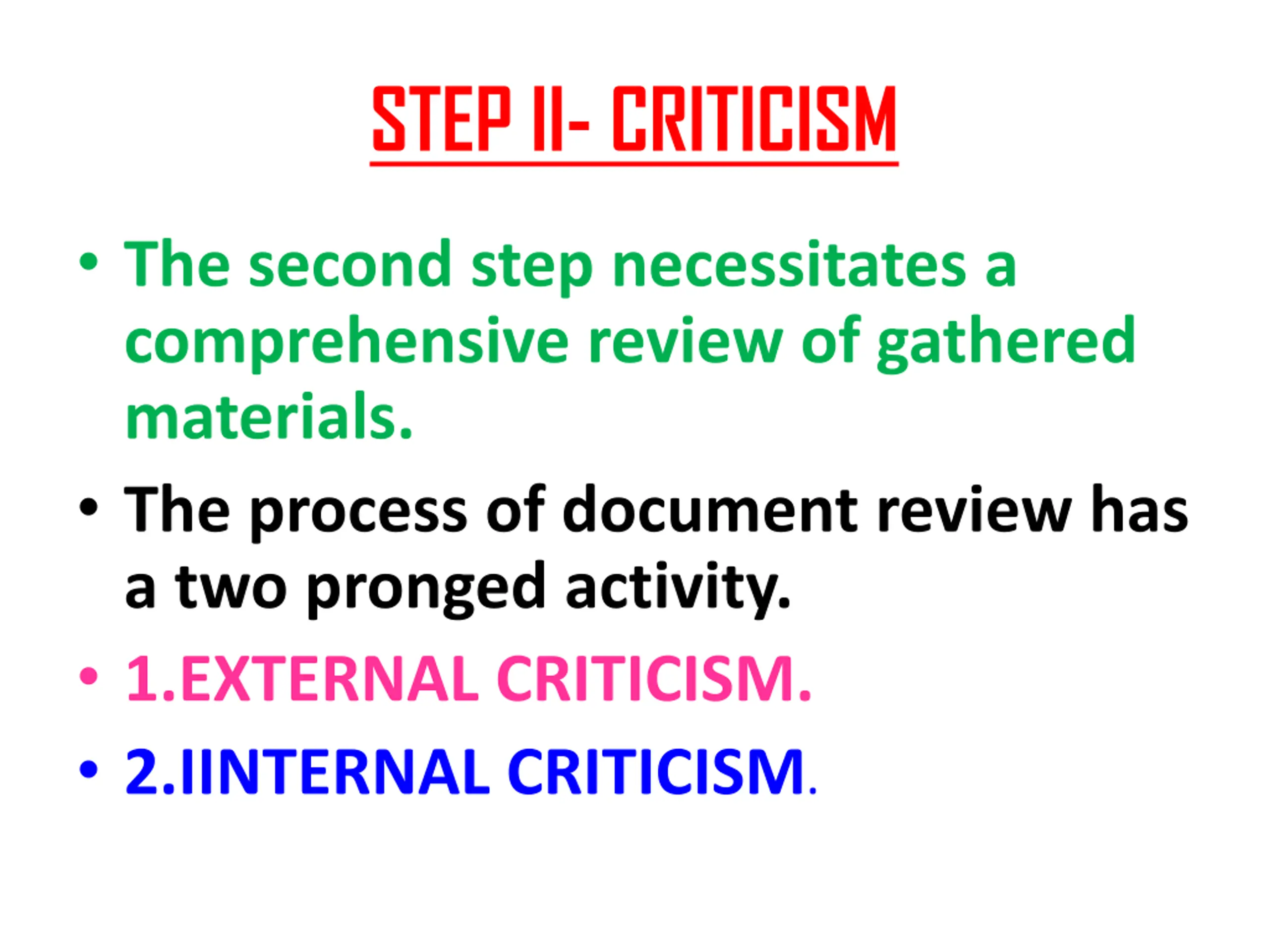 STEP II- CRITICISM The second step necessitates a comprehensive review of gathered materials. The process of document review has a two pronged activity. 1.EXTERNAL CRITICISM. 2.IINTERNAL CRITICISM.