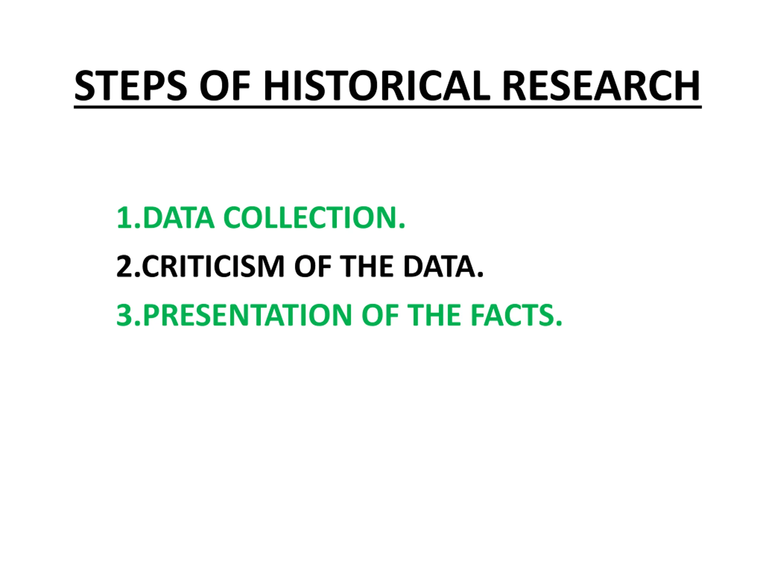 STEPS OF HISTORICAL RESEARCH 1.DATA COLLECTION. 2.CRITICISM OF THE DATA. 3.PRESENTATION OF THE FACTS.