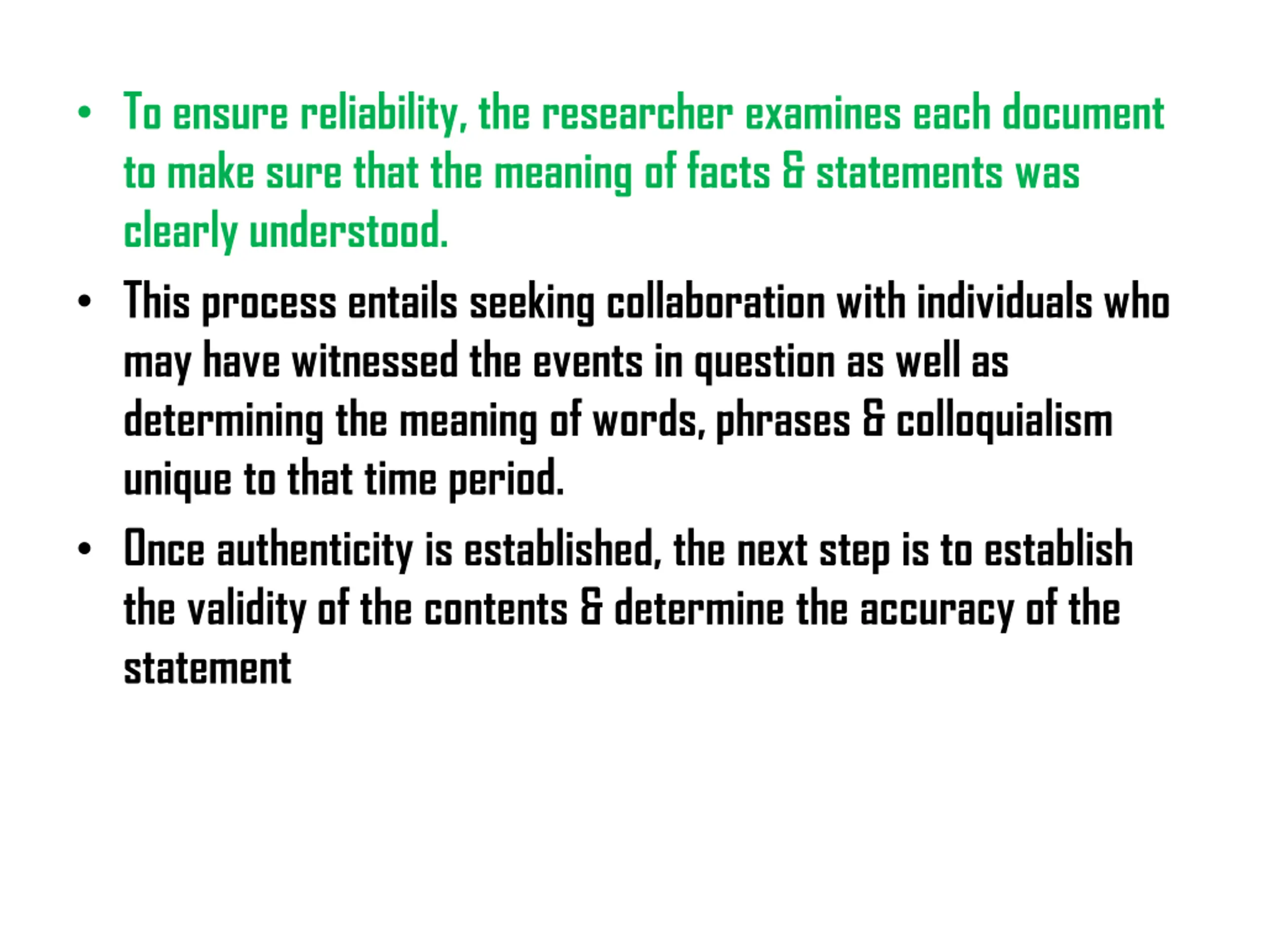 To ensure reliability, the researcher examines each document to make sure that the meaning of facts & statements was clearly understood. This process entails seeking collaboration with individuals who may have witnessed the events in question as well as determining the meaning of words, phrases & colloquialism unique to that time period. Once authenticity is established, the next step is to establish the validity of the contents & determine the accuracy of the statement