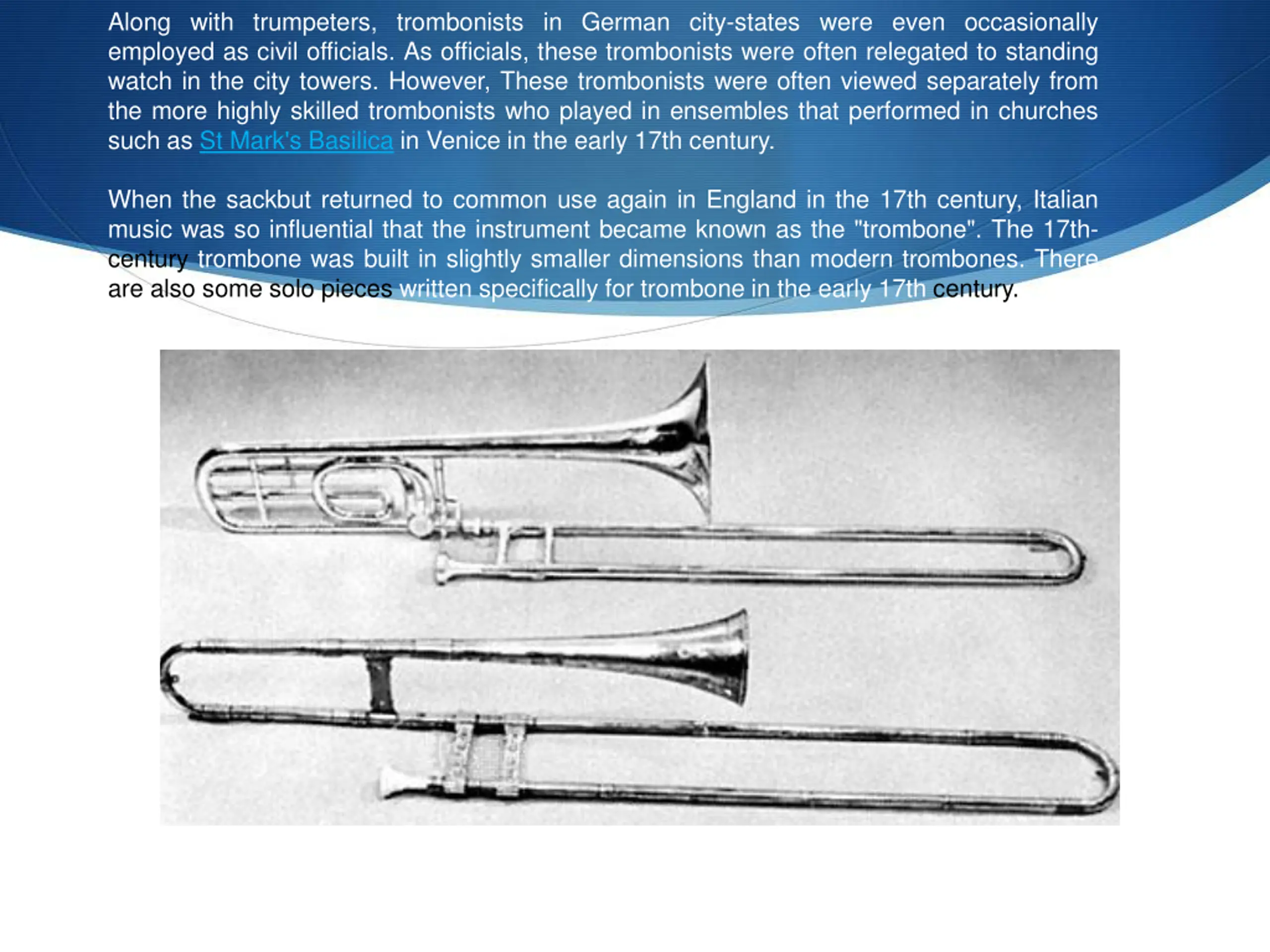 Along with trumpeters, trombonists in German city-states were even occasionally employed as civil officials. As officials, these trombonists were often relegated to standing watch in the city towers. However, These trombonists were often viewed separately from the more highly skilled trombonists who played in ensembles that performed in churches such as St Mark's Basilica in Venice in the early 17th century. When the sackbut returned to common use again in England in the 17th century, Italian music was so influential that the instrument became known as the "trombone". The 17th- century trombone was built in slightly smaller dimensions than modern trombones. There are also some solo pieces written specifically for trombone in the early 17th century.