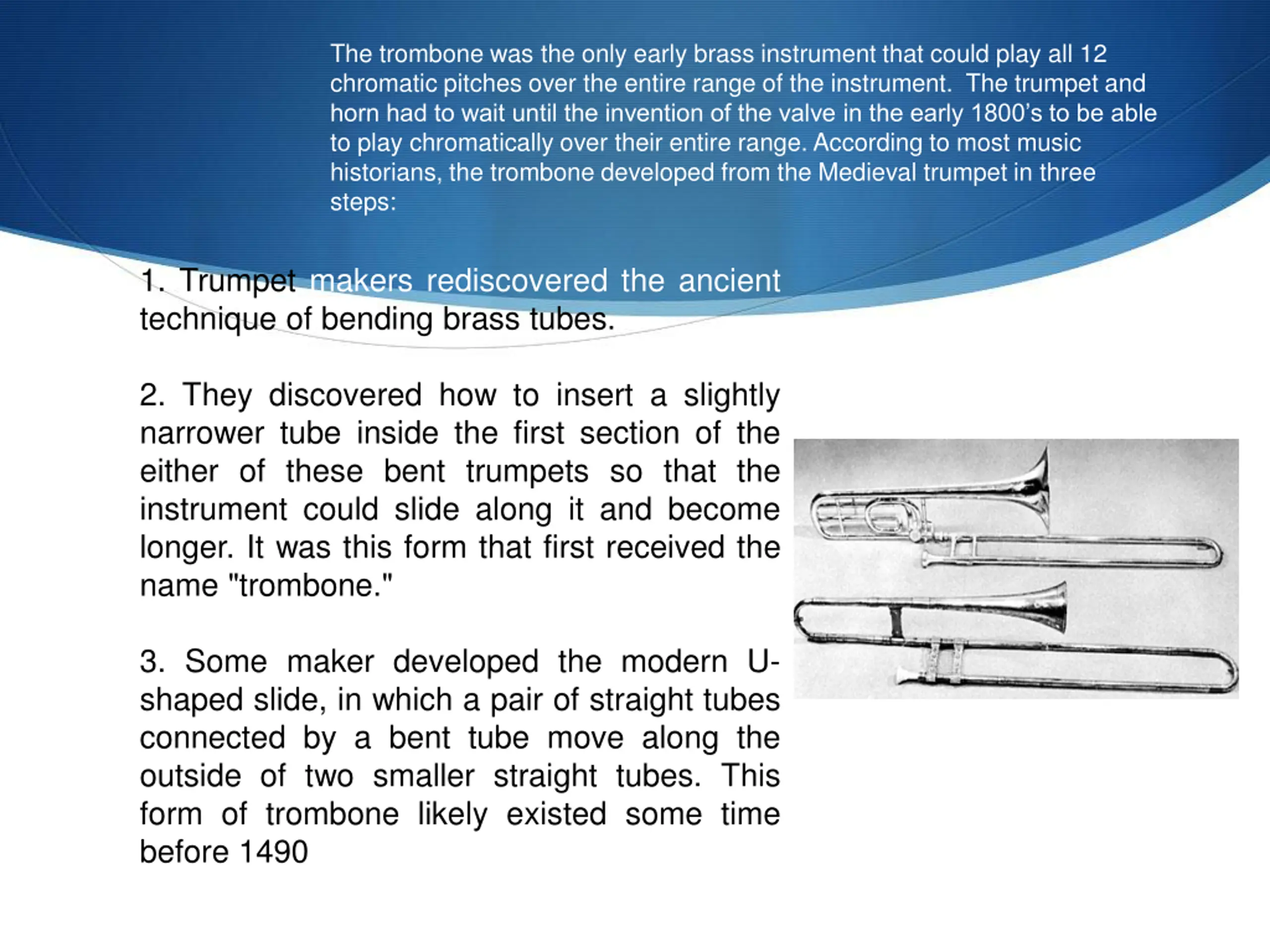 The trombone was the only early brass instrument that could play all 12 chromatic pitches over the entire range of the instrument. The trumpet and horn had to wait until the invention of the valve in the early 1800 s to be able to play chromatically over their entire range. According to most music historians, the trombone developed from the Medieval trumpet in three steps: 1. Trumpet makers rediscovered the ancient technique of bending brass tubes. 2. They discovered how to insert a slightly narrower tube inside the first section of the either of these bent trumpets so that the instrument could slide along it and become longer. It was this form that first received the name "trombone." 3. Some maker developed the modern U- shaped slide, in which a pair of straight tubes connected by a bent tube move along the outside of two smaller straight tubes. This form of trombone likely existed some time before 1490