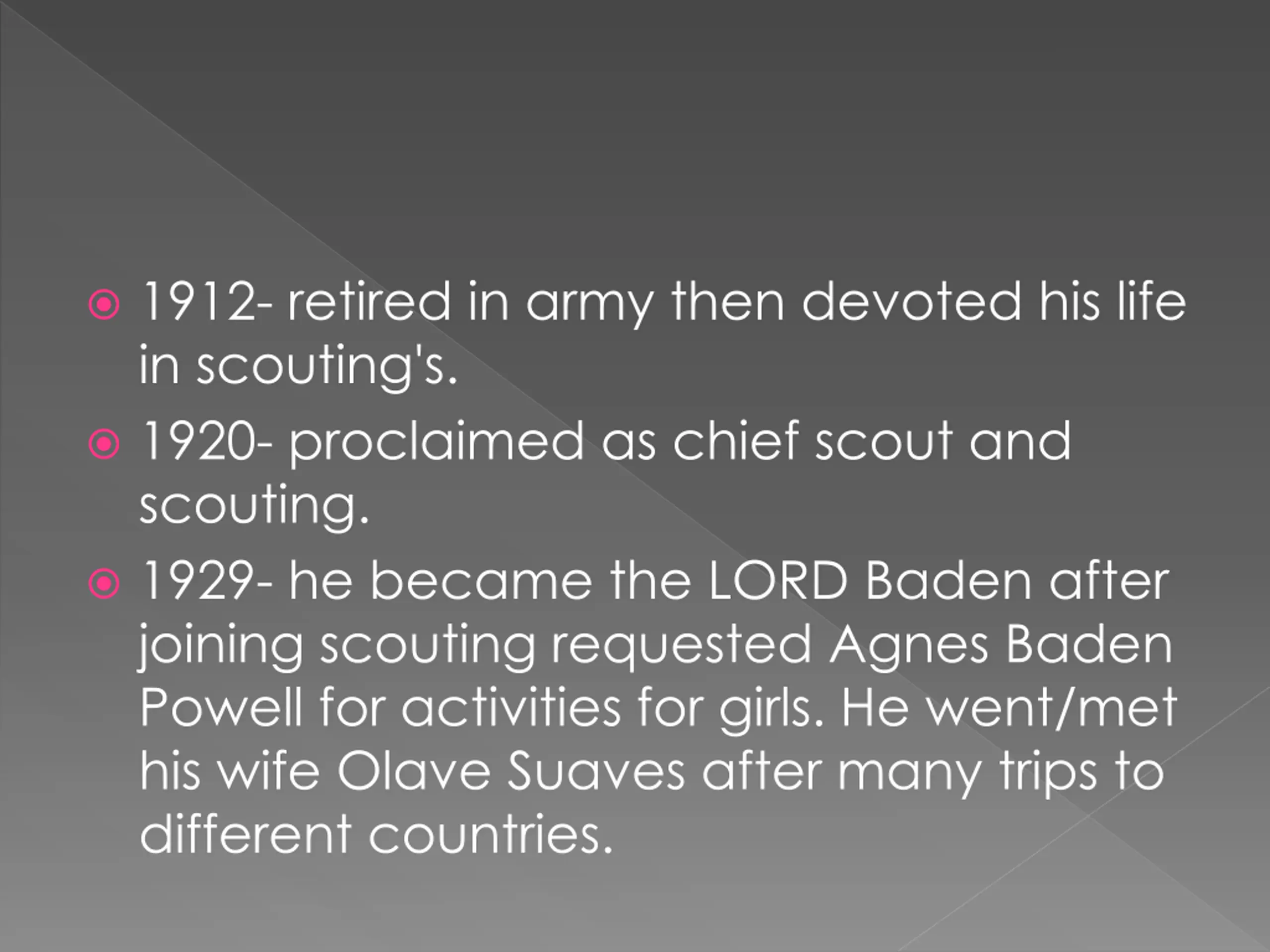 1912- retired in army then devoted his life in scouting's. 1920- proclaimed as chief scout and scouting. 1929- he became the LORD Baden after joining scouting requested Agnes Baden Powell for activities for girls. He went/met his wife Olave Suaves after many trips to different countries.