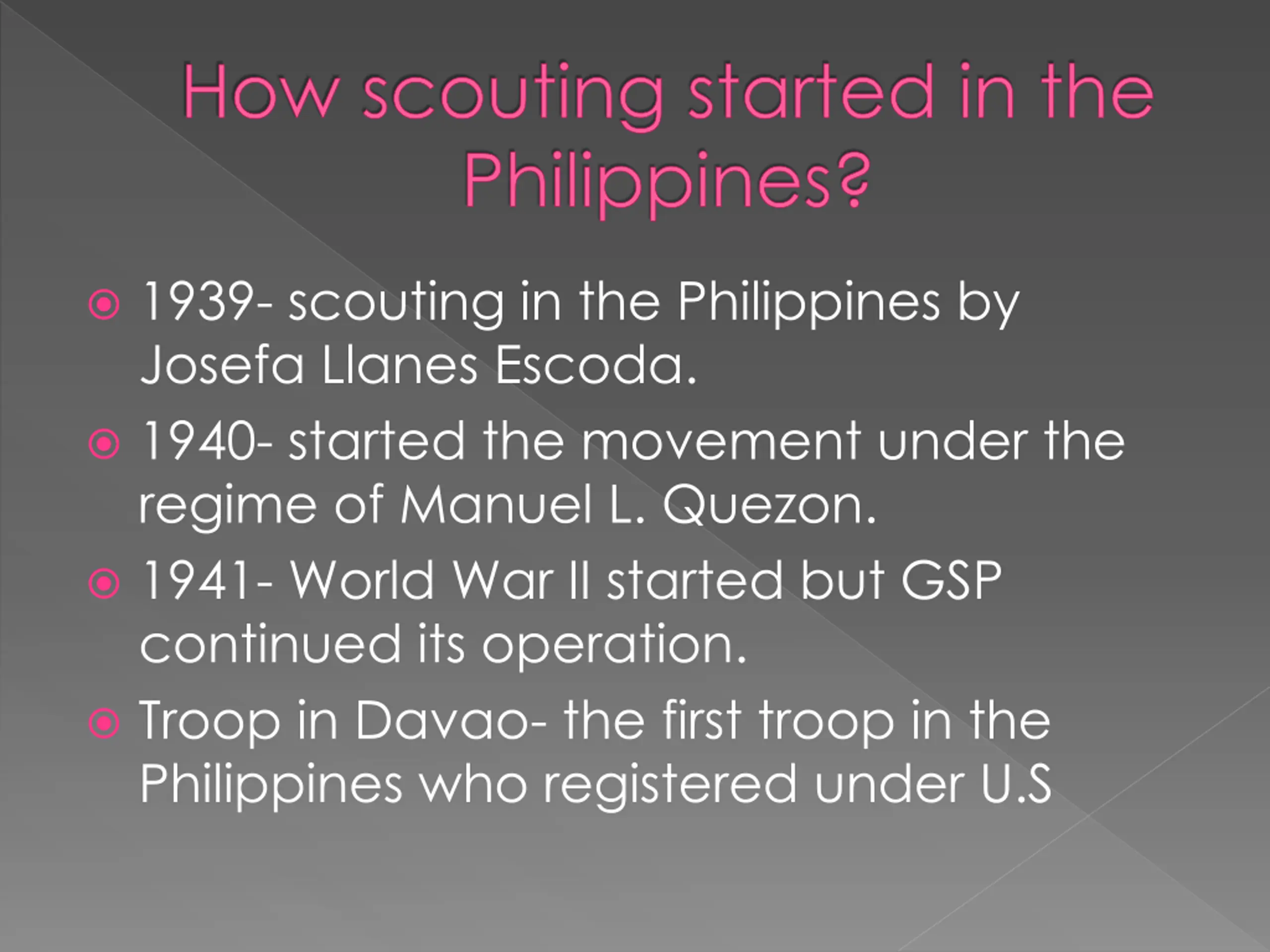 How scouting started in the Philippines? 1939- scouting in the Philippines by Josefa Llanes Escoda. 1940- started the movement under the regime of Manuel L. Quezon. 1941- World War II started but GSP continued its operation. Troop in Davao- the first troop in the Philippines who registered under U.S