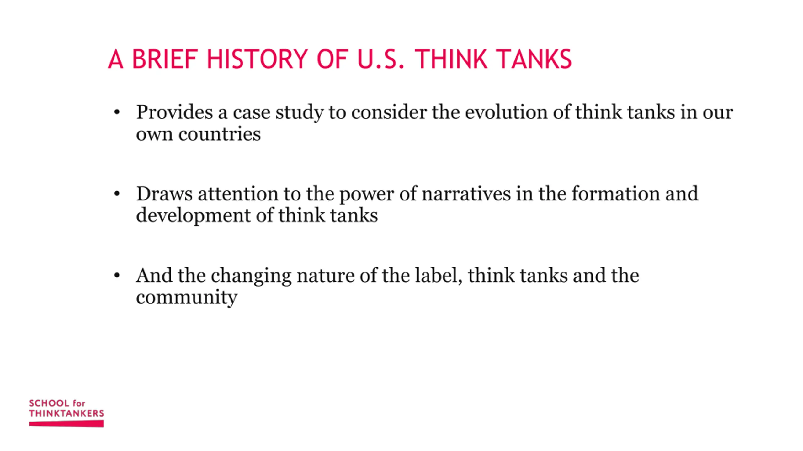 A BRIEF HISTORY OF U.S. THINK TANKS Provides a case study to consider the evolution of think tanks in our own countries Draws attention to the power of narratives in the formation and development of think tanks And the changing nature of the label, think tanks and the community