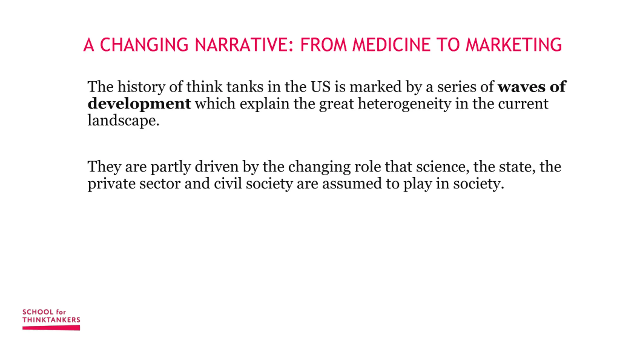 A CHANGING NARRATIVE: FROM MEDICINE TO MARKETING The history of think tanks in the US is marked by a series of waves of development which explain the great heterogeneity in the current landscape. They are partly driven by the changing role that science, the state, the private sector and civil society are assumed to play in society.