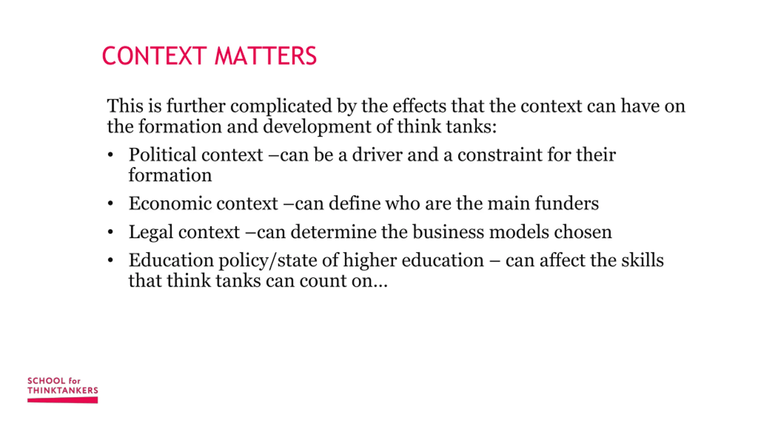CONTEXT MATTERS This is further complicated by the effects that the context can have on the formation and development of think tanks: Political context can be a driver and a constraint for their formation Economic context can define who are the main funders Legal context can determine the business models chosen Education policy/state of higher education can affect the skills that think tanks can count on