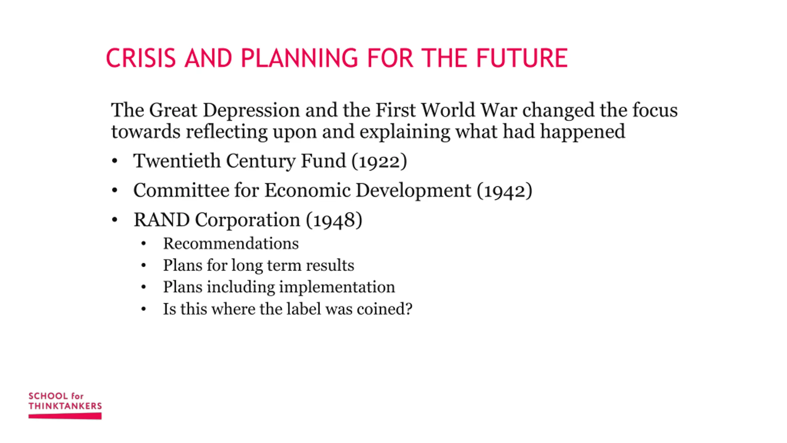 CRISIS AND PLANNING FOR THE FUTURE The Great Depression and the First World War changed the focus towards reflecting upon and explaining what had happened Twentieth Century Fund (1922) Committee for Economic Development (1942) RAND Corporation (1948) Recommendations Plans for long term results Plans including implementation Is this where the label was coined?