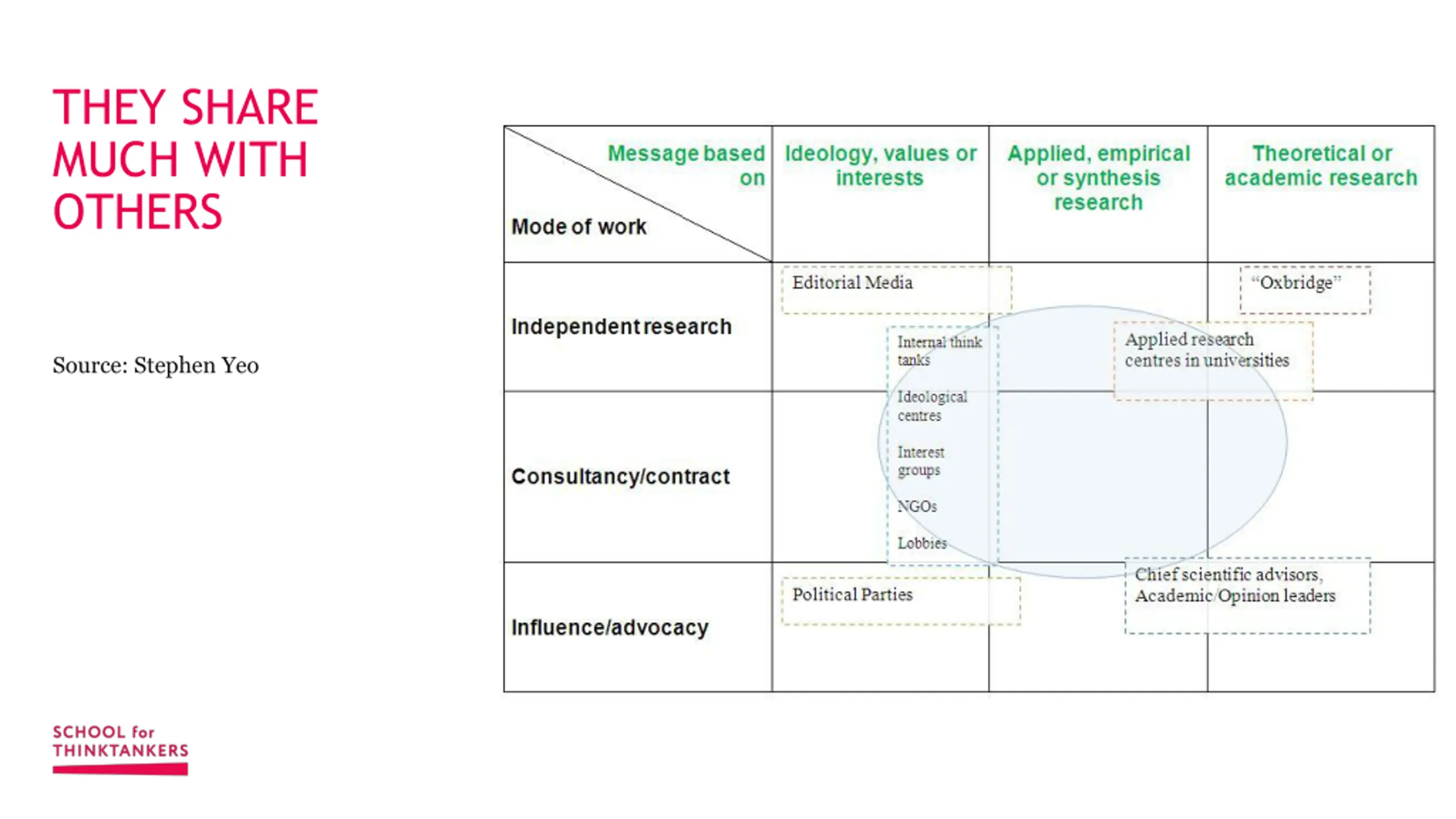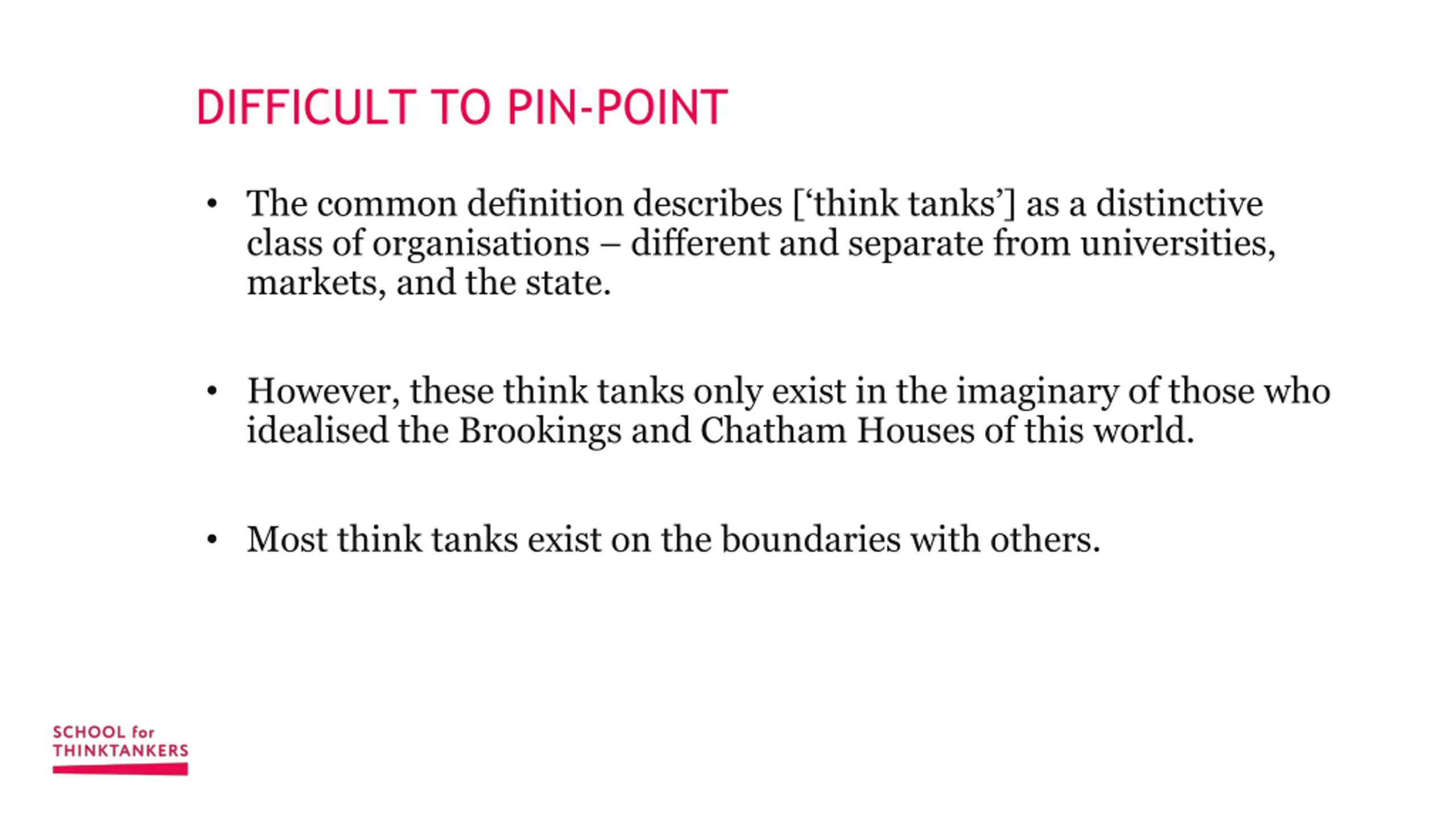 DIFFICULT TO PIN-POINT The common definition describes [ think tanks ] as a distinctive class of organisations different and separate from universities, markets, and the state. However, these think tanks only exist in the imaginary of those who idealised the Brookings and Chatham Houses of this world. Most think tanks exist on the boundaries with others.