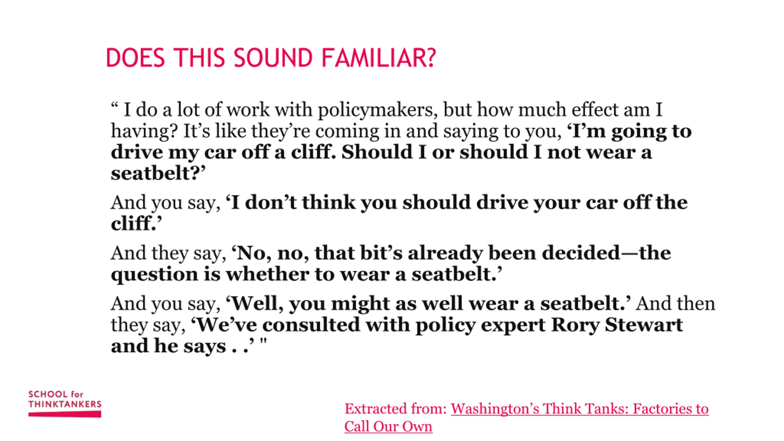 DOES THIS SOUND FAMILIAR? I do a lot of work with policymakers, but how much effect am I having? It s like they re coming in and saying to you, I m going to drive my car off a cliff. Should I or should I not wear a seatbelt? And you say, I don t think you should drive your car off the cliff. And they say, No, no, that bit s already been decided the question is whether to wear a seatbelt. And you say, Well, you might as well wear a seatbelt. And then they say, We ve consulted with policy expert Rory Stewart and he says . . " Extracted from: Washington s Think Tanks: Factories to Call Our Own