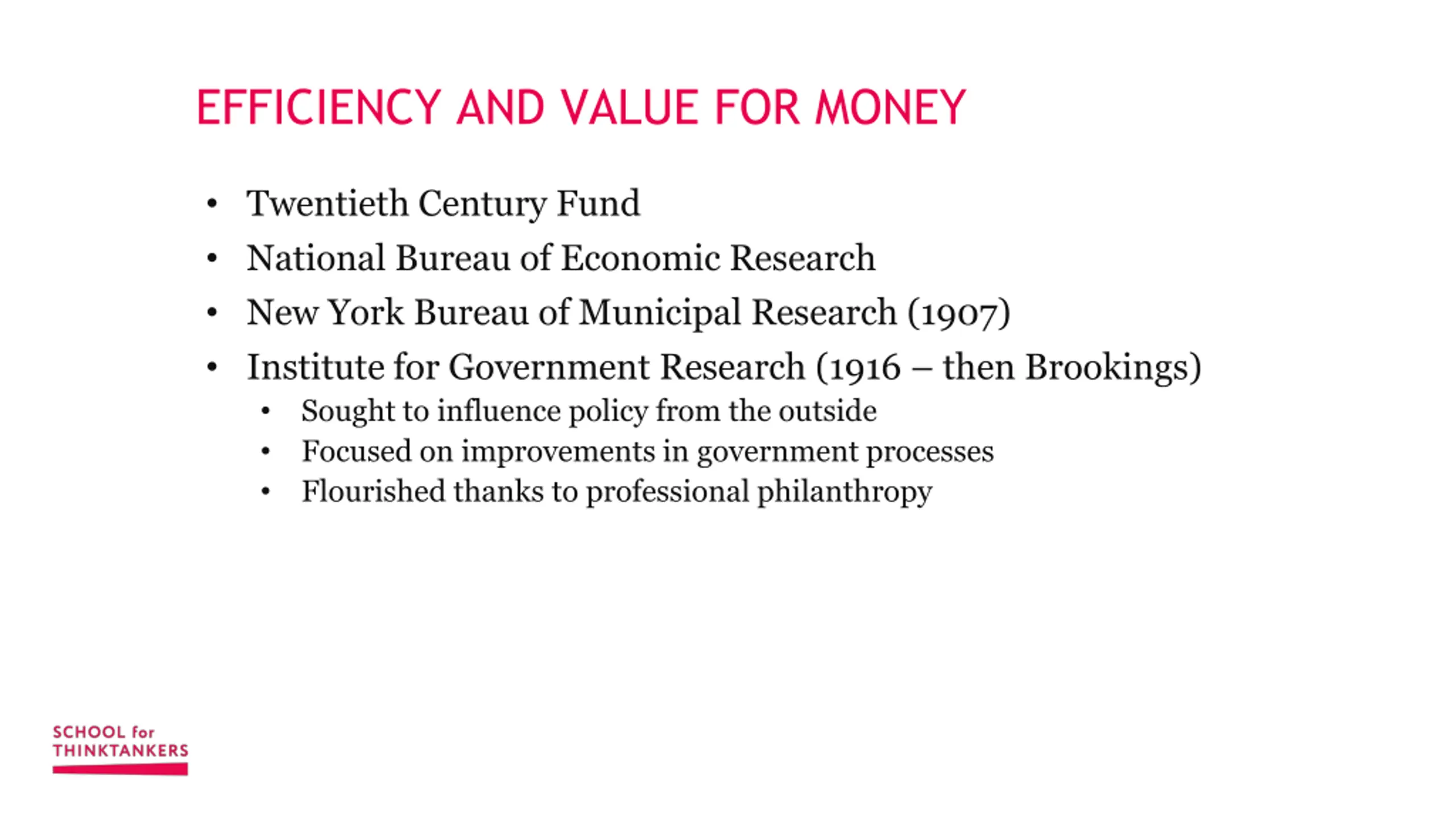 EFFICIENCY AND VALUE FOR MONEY Twentieth Century Fund National Bureau of Economic Research New York Bureau of Municipal Research (1907) Institute for Government Research (1916 then Brookings) Sought to influence policy from the outside Focused on improvements in government processes Flourished thanks to professional philanthropy
