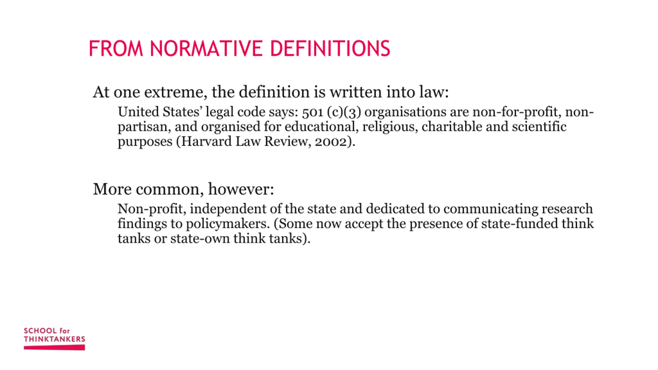 FROM NORMATIVE DEFINITIONS At one extreme, the definition is written into law: United States legal code says: 501 (c)(3) organisations are non-for-profit, non- partisan, and organised for educational, religious, charitable and scientific purposes (Harvard Law Review, 2002). More common, however: Non-profit, independent of the state and dedicated to communicating research findings to policymakers. (Some now accept the presence of state-funded think tanks or state-own think tanks).