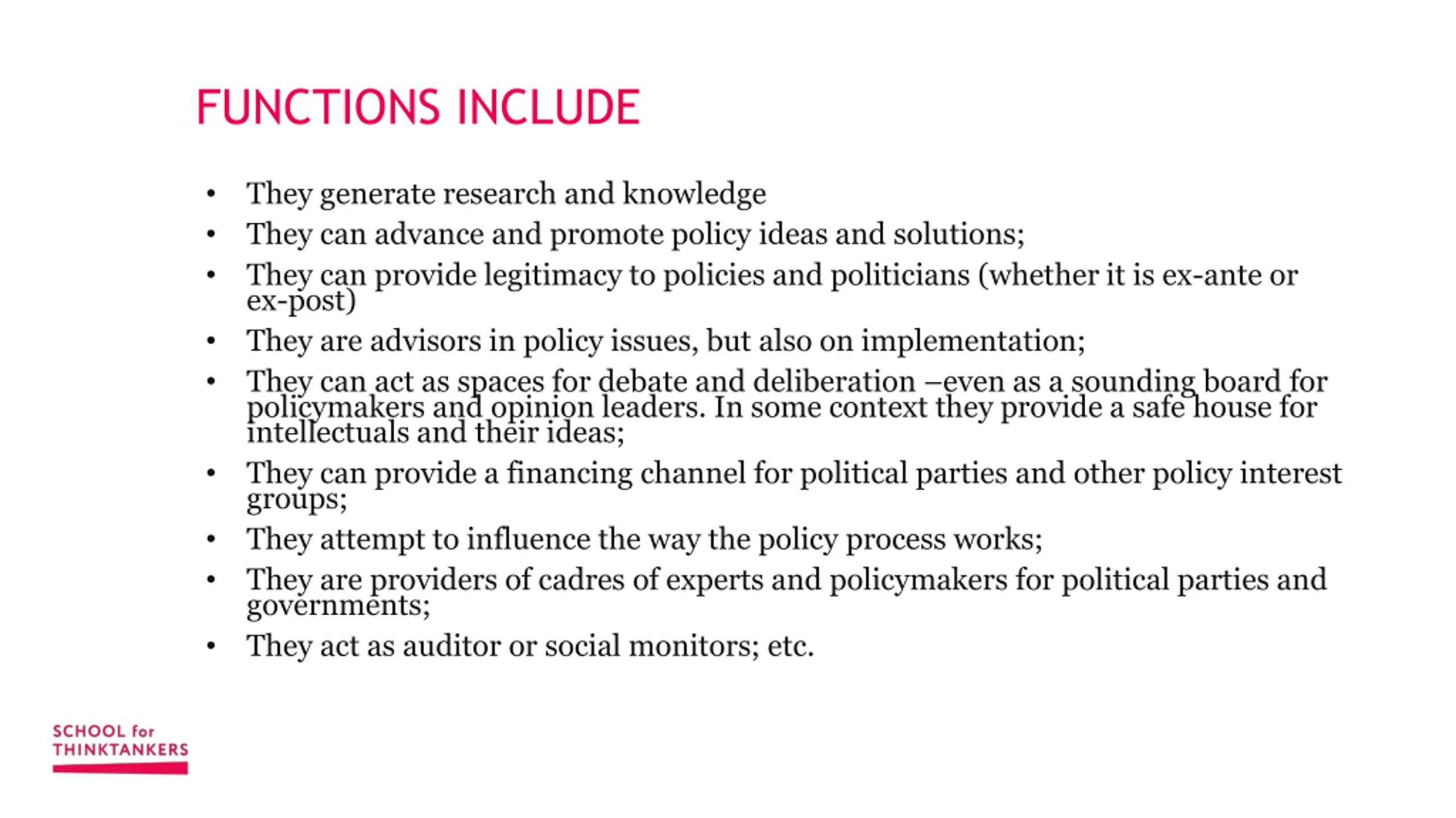 FUNCTIONS INCLUDE They generate research and knowledge They can advance and promote policy ideas and solutions; They can provide legitimacy to policies and politicians (whether it is ex-ante or ex-post) They are advisors in policy issues, but also on implementation; They can act as spaces for debate and deliberation even as a sounding board for policymakers and opinion leaders. In some context they provide a safe house for intellectuals and their ideas; They can provide a financing channel for political parties and other policy interest groups; They attempt to influence the way the policy process works; They are providers of cadres of experts and policymakers for political parties and governments; They act as auditor or social monitors; etc.