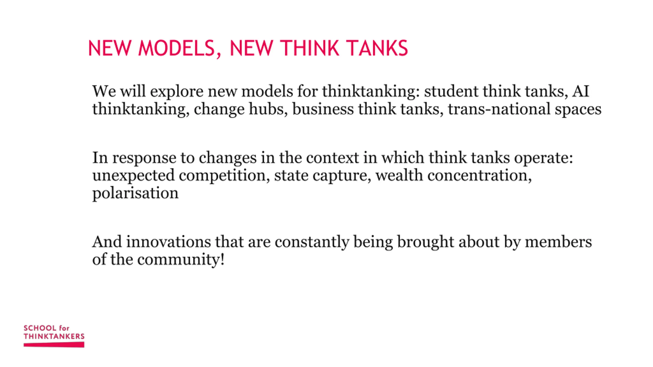 NEW MODELS, NEW THINK TANKS We will explore new models for thinktanking: student think tanks, AI thinktanking, change hubs, business think tanks, trans-national spaces In response to changes in the context in which think tanks operate: unexpected competition, state capture, wealth concentration, polarisation And innovations that are constantly being brought about by members of the community!