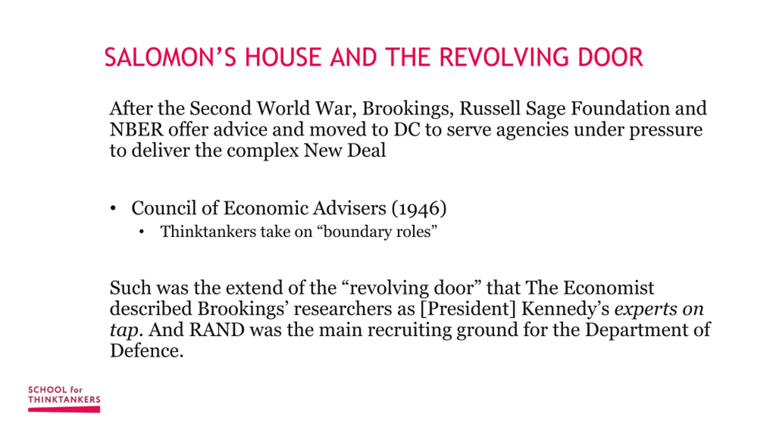 SALOMONS HOUSE AND THE REVOLVING DOOR After the Second World War, Brookings, Russell Sage Foundation and NBER offer advice and moved to DC to serve agencies under pressure to deliver the complex New Deal Council of Economic Advisers (1946) Thinktankers take on boundary roles Such was the extend of the revolving door that The Economist described Brookings researchers as [President] Kennedy s experts on tap. And RAND was the main recruiting ground for the Department of Defence.