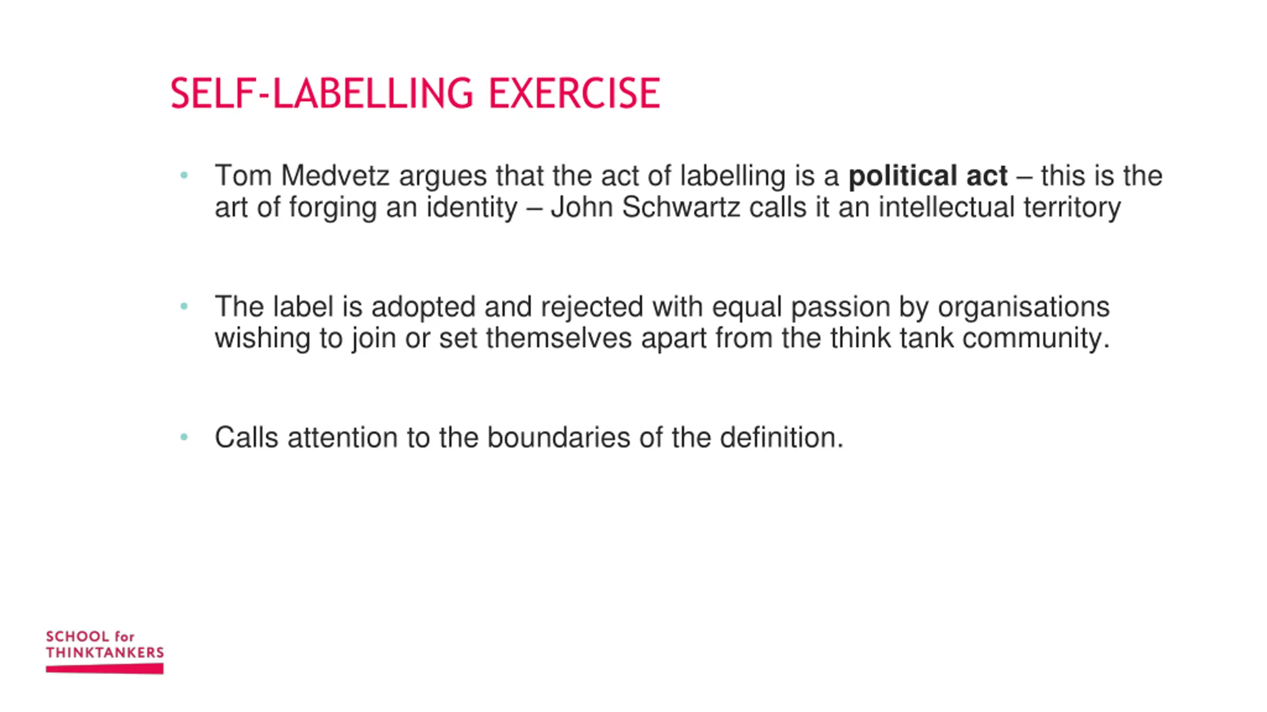 SELF-LABELLING EXERCISE Tom Medvetz argues that the act of labelling is a political act this is the art of forging an identity John Schwartz calls it an intellectual territory The label is adopted and rejected with equal passion by organisations wishing to join or set themselves apart from the think tank community. Calls attention to the boundaries of the definition.