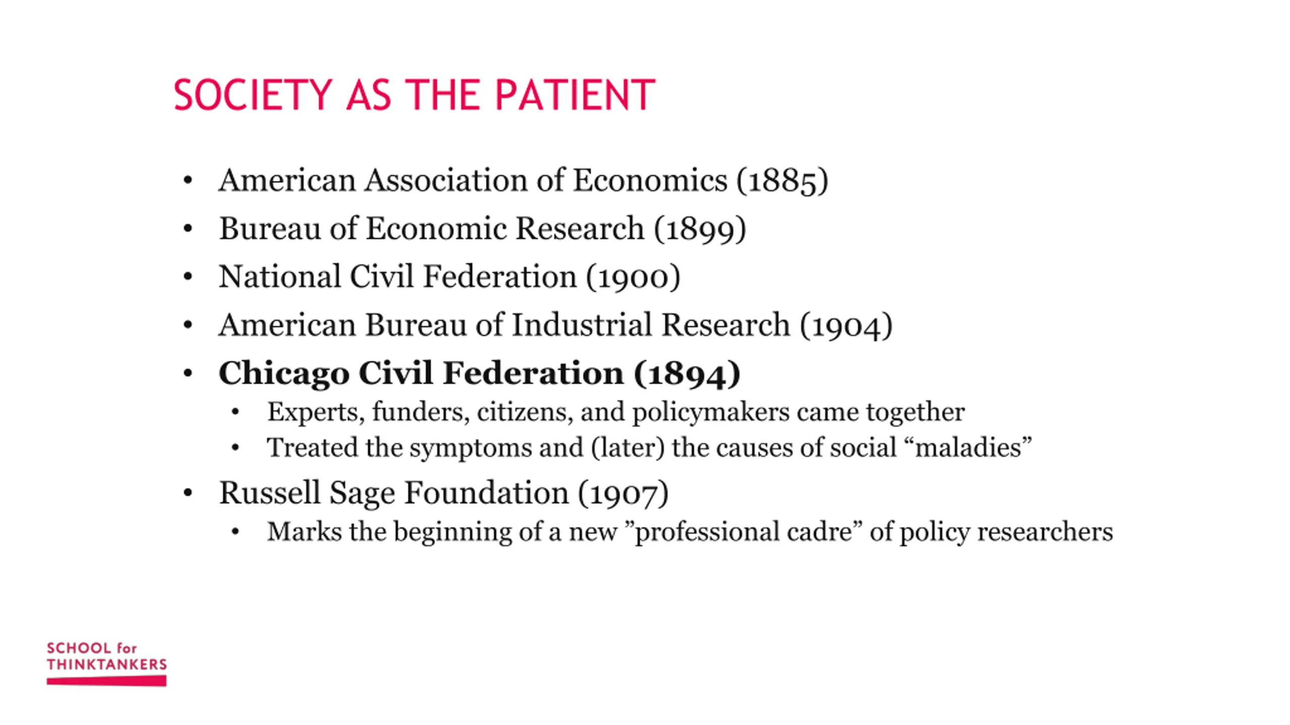 SOCIETY AS THE PATIENT American Association of Economics (1885) Bureau of Economic Research (1899) National Civil Federation (1900) American Bureau of Industrial Research (1904) Chicago Civil Federation (1894) Experts, funders, citizens, and policymakers came together Treated the symptoms and (later) the causes of social maladies Russell Sage Foundation (1907) Marks the beginning of a new professional cadre of policy researchers