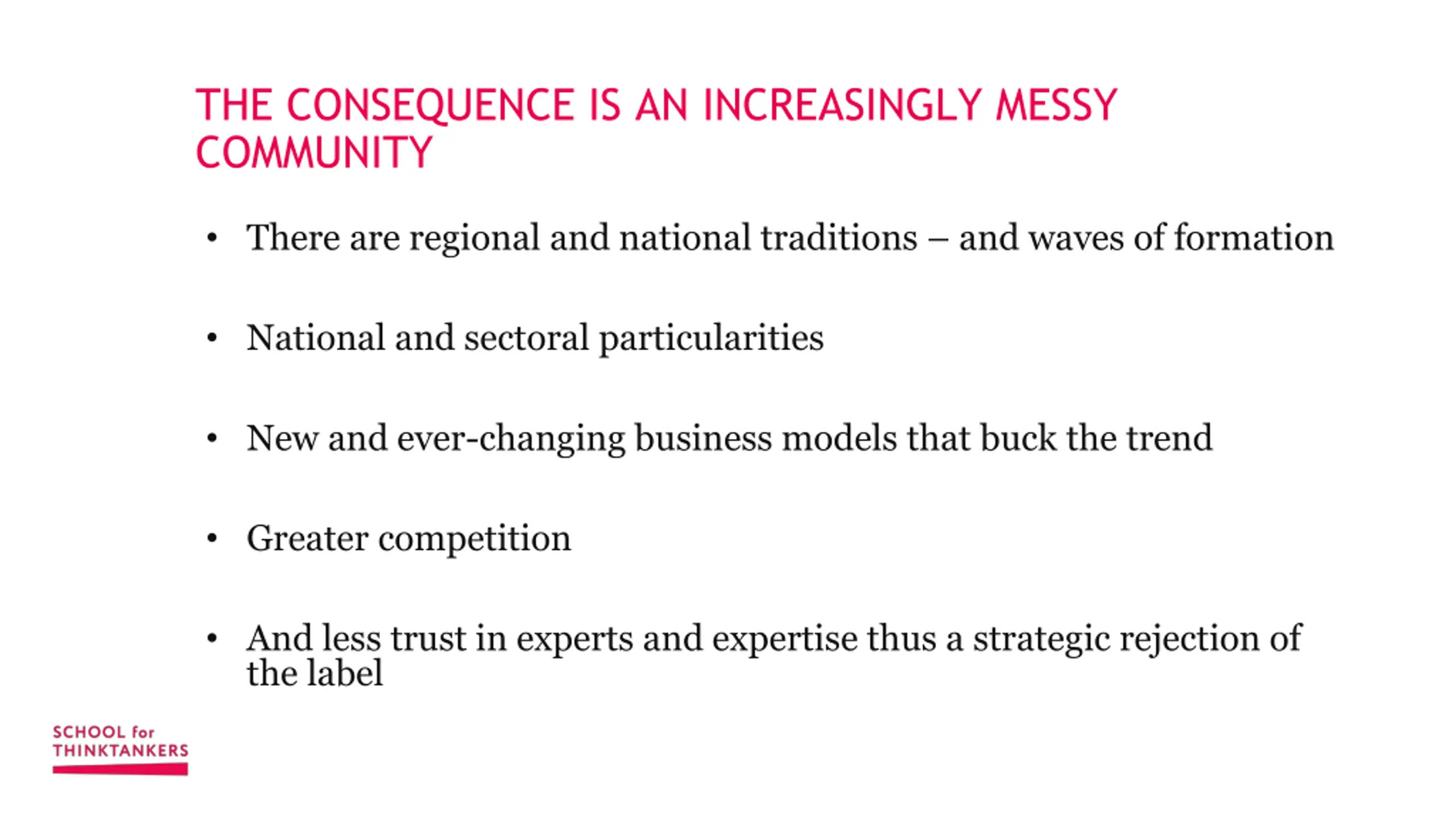 THE CONSEQUENCE IS AN INCREASINGLY MESSY COMMUNITY There are regional and national traditions and waves of formation National and sectoral particularities New and ever-changing business models that buck the trend Greater competition And less trust in experts and expertise thus a strategic rejection of the label