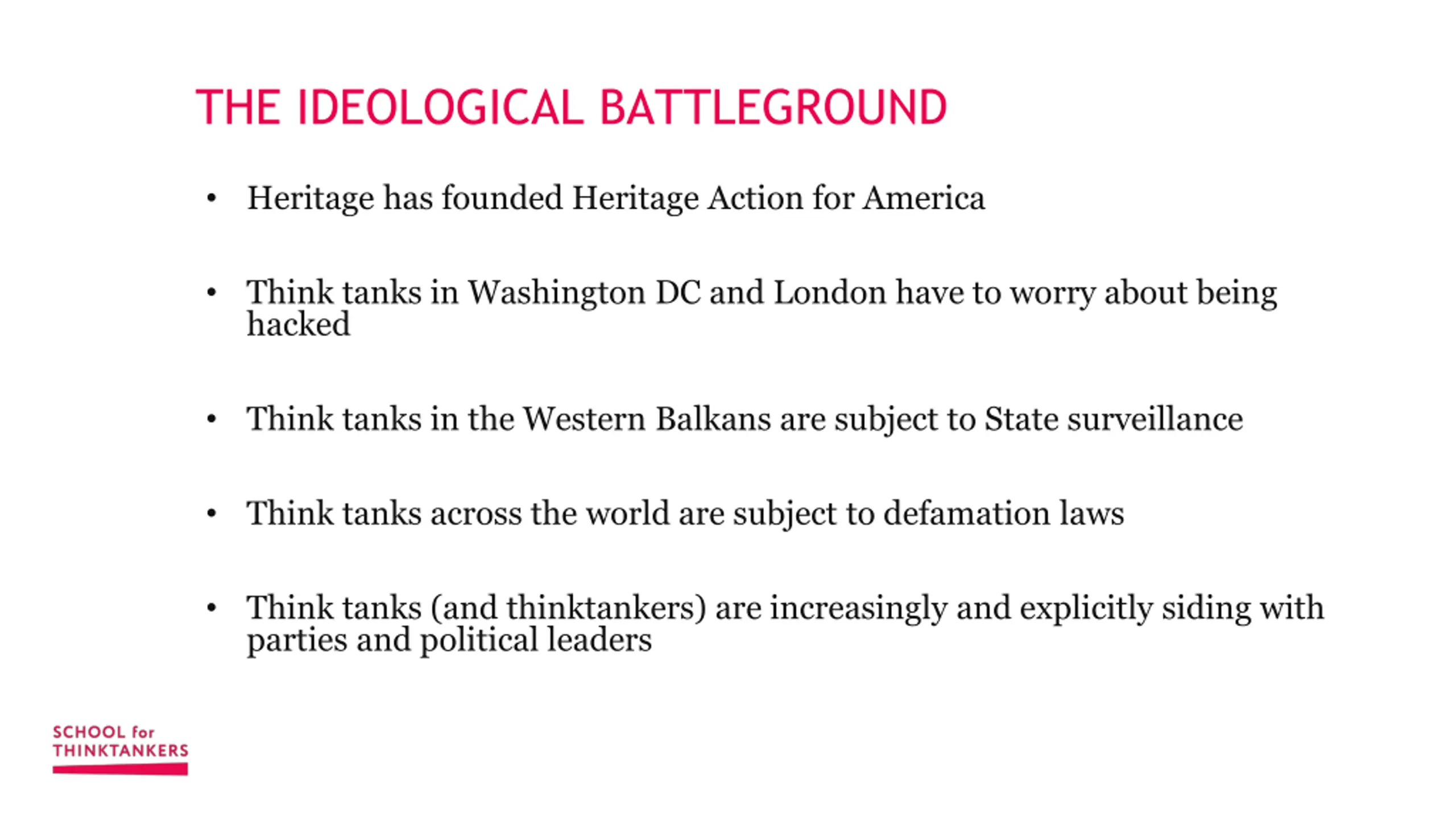 THE IDEOLOGICAL BATTLEGROUND Heritage has founded Heritage Action for America Think tanks in Washington DC and London have to worry about being hacked Think tanks in the Western Balkans are subject to State surveillance Think tanks across the world are subject to defamation laws Think tanks (and thinktankers) are increasingly and explicitly siding with parties and political leaders