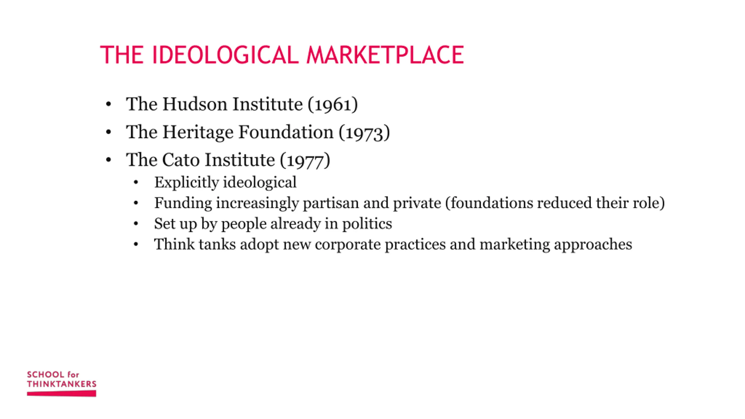 THE IDEOLOGICAL MARKETPLACE The Hudson Institute (1961) The Heritage Foundation (1973) The Cato Institute (1977) Explicitly ideological Funding increasingly partisan and private (foundations reduced their role) Set up by people already in politics Think tanks adopt new corporate practices and marketing approaches