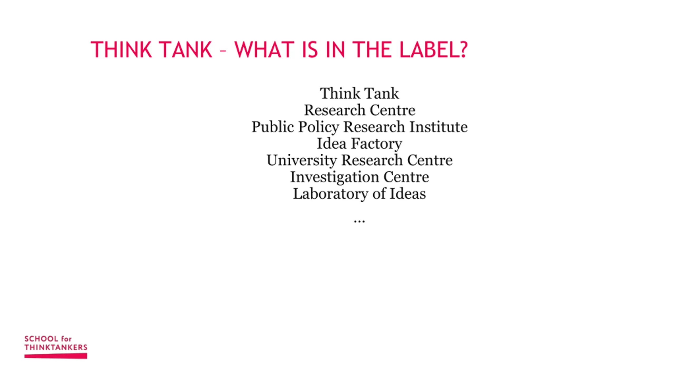 THINK TANK WHAT IS IN THE LABEL? Think Tank Research Centre Public Policy Research Institute Idea Factory University Research Centre Investigation Centre Laboratory of Ideas