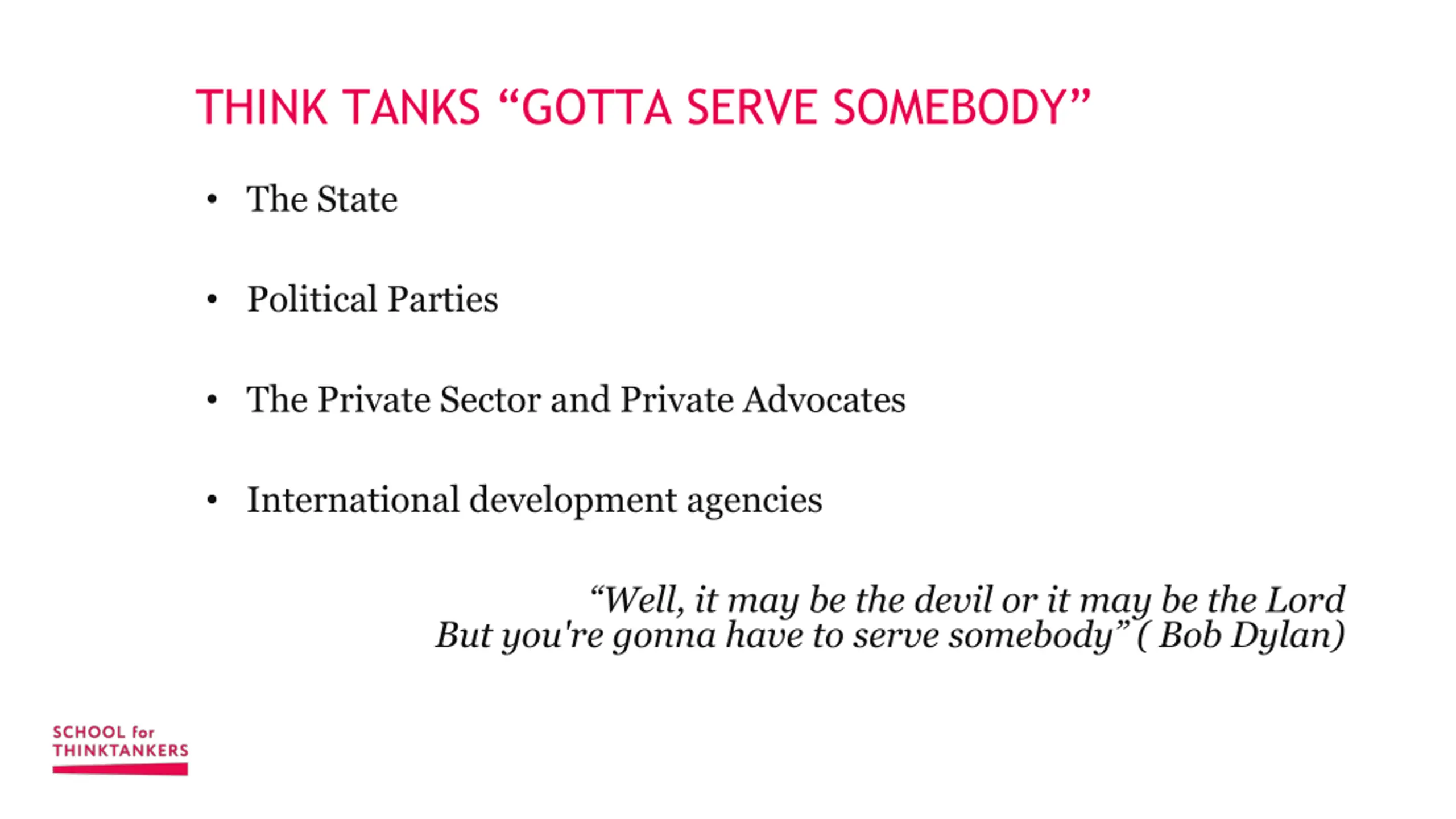 THINK TANKS GOTTA SERVE SOMEBODY The State Political Parties The Private Sector and Private Advocates International development agencies Well, it may be the devil or it may be the Lord But you're gonna have to serve somebody ( Bob Dylan)