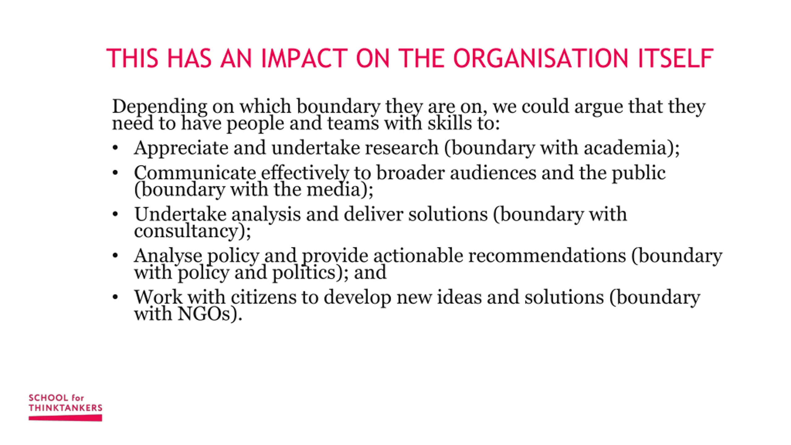 THIS HAS AN IMPACT ON THE ORGANISATION ITSELF Depending on which boundary they are on, we could argue that they need to have people and teams with skills to: Appreciate and undertake research (boundary with academia); Communicate effectively to broader audiences and the public (boundary with the media); Undertake analysis and deliver solutions (boundary with consultancy); Analyse policy and provide actionable recommendations (boundary with policy and politics); and Work with citizens to develop new ideas and solutions (boundary with NGOs).