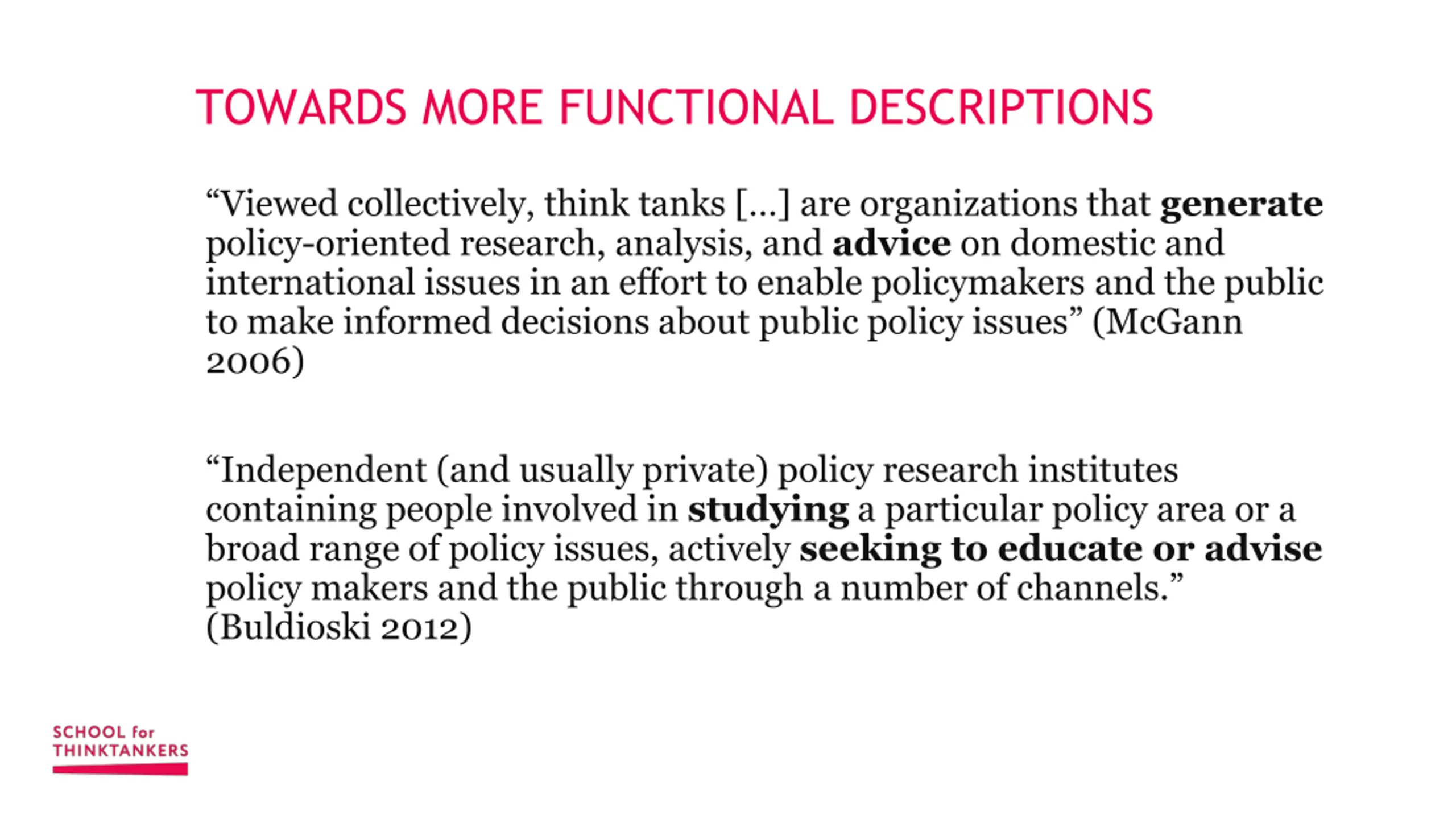 TOWARDS MORE FUNCTIONAL DESCRIPTIONS Viewed collectively, think tanks [ ] are organizations that generate policy-oriented research, analysis, and advice on domestic and international issues in an effort to enable policymakers and the public to make informed decisions about public policy issues (McGann 2006) Independent (and usually private) policy research institutes containing people involved in studying a particular policy area or a broad range of policy issues, actively seeking to educate or advise policy makers and the public through a number of channels. (Buldioski 2012)