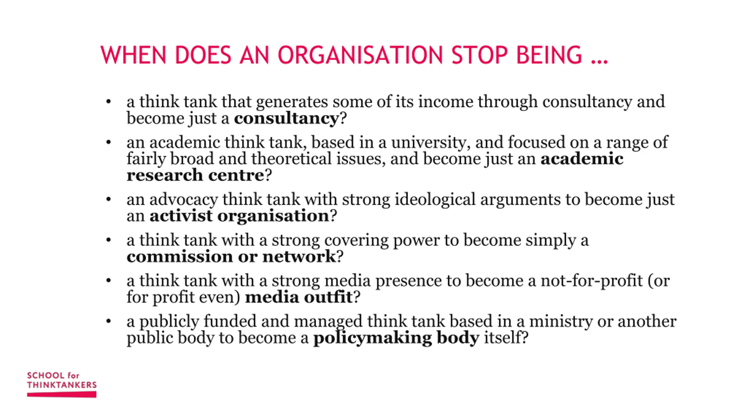 WHEN DOES AN ORGANISATION STOP BEING a think tank that generates some of its income through consultancy and become just a consultancy? an academic think tank, based in a university, and focused on a range of fairly broad and theoretical issues, and become just an academic research centre? an advocacy think tank with strong ideological arguments to become just an activist organisation? a think tank with a strong covering power to become simply a commission or network? a think tank with a strong media presence to become a not-for-profit (or for profit even) media outfit? a publicly funded and managed think tank based in a ministry or another public body to become a policymaking body itself?