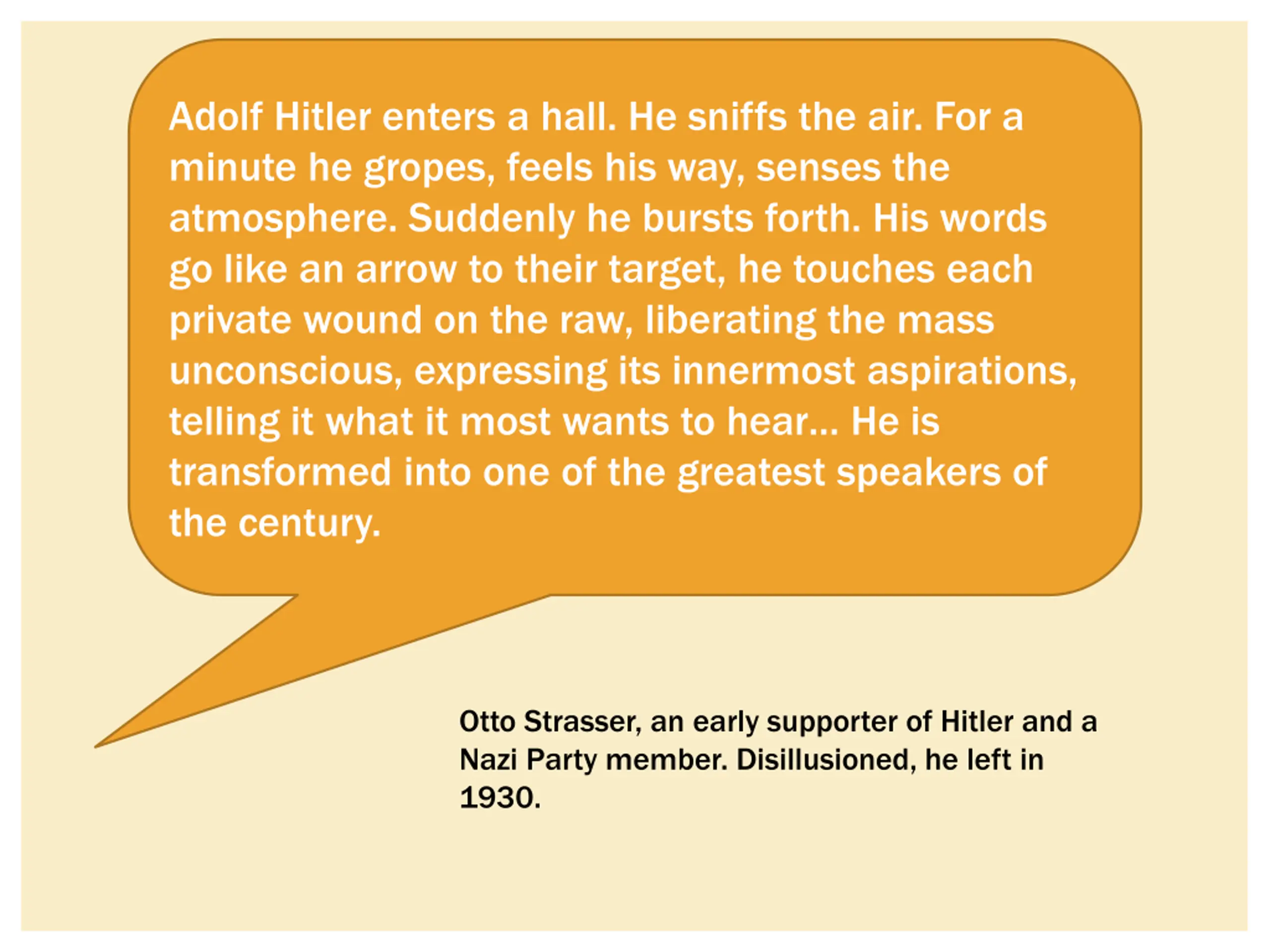 Adolf Hitler enters a hall. He sniffs the air. For a minute he gropes, feels his way, senses the atmosphere. Suddenly he bursts forth. His words go like an arrow to their target, he touches each private wound on the raw, liberating the mass unconscious, expressing its innermost aspirations, telling it what it most wants to hear He is transformed into one of the greatest speakers of the century. Otto Strasser, an early supporter of Hitler and a Nazi Party member. Disillusioned, he left in 1930.