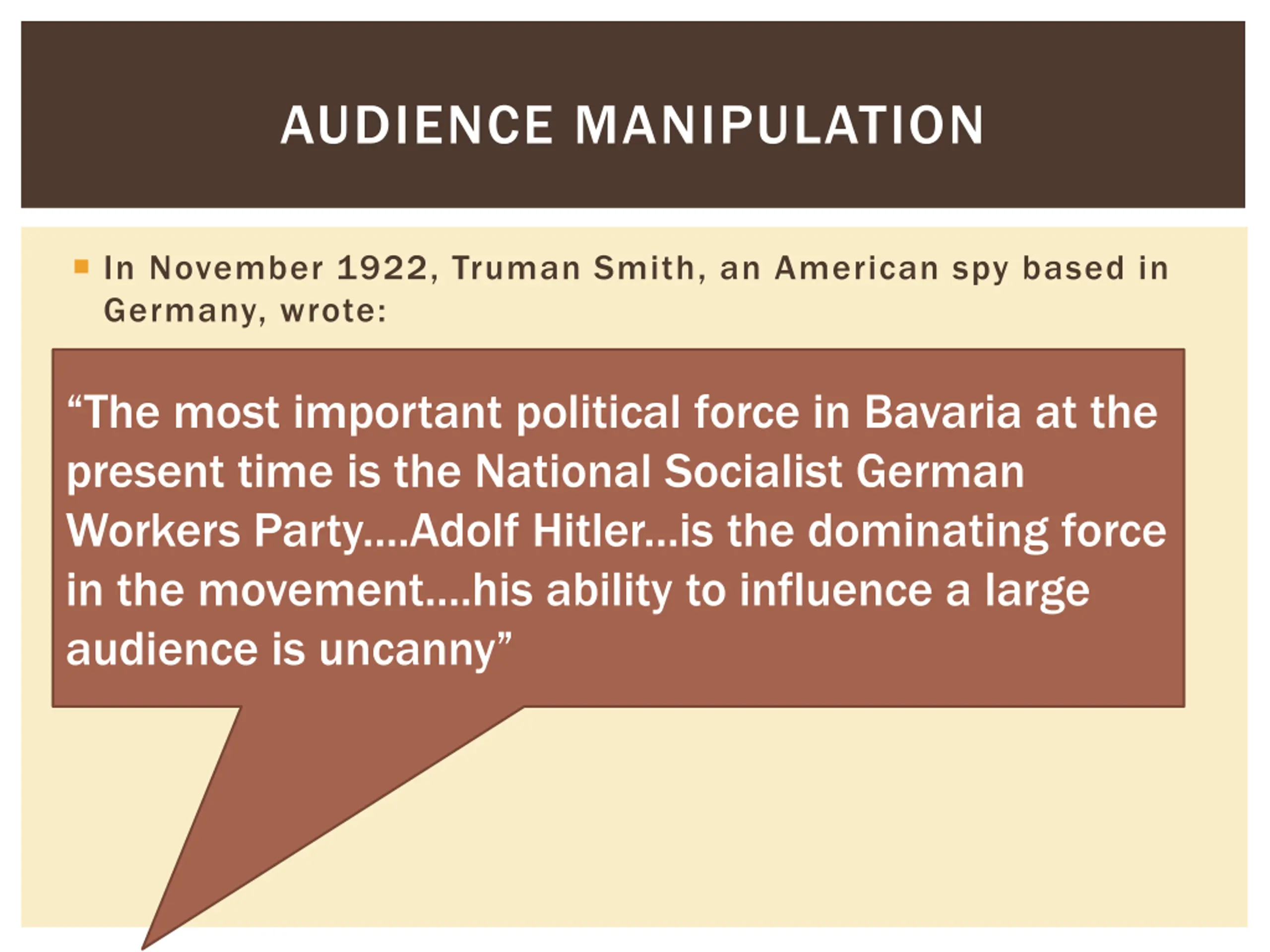 AUDIENCE MANIPULATION In November 1922, Truman Smith, an American spy based in Germany, wrote: The most important political force in Bavaria at the present time is the National Socialist German Workers Party....Adolf Hitler...is the dominating force in the movement....his ability to influence a large audience is uncanny