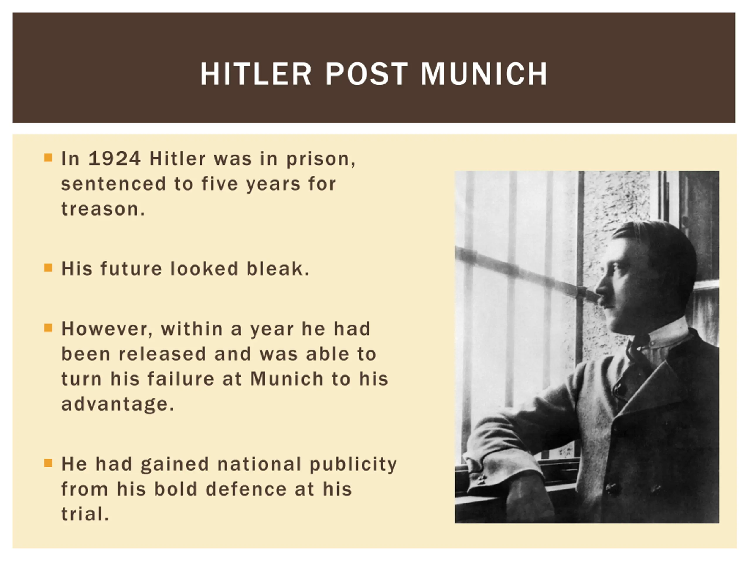 HITLER POST MUNICH In 1924 Hitler was in prison, sentenced to five years for treason. His future looked bleak. However, within a year he had been released and was able to turn his failure at Munich to his advantage. He had gained national publicity from his bold defence at his trial.