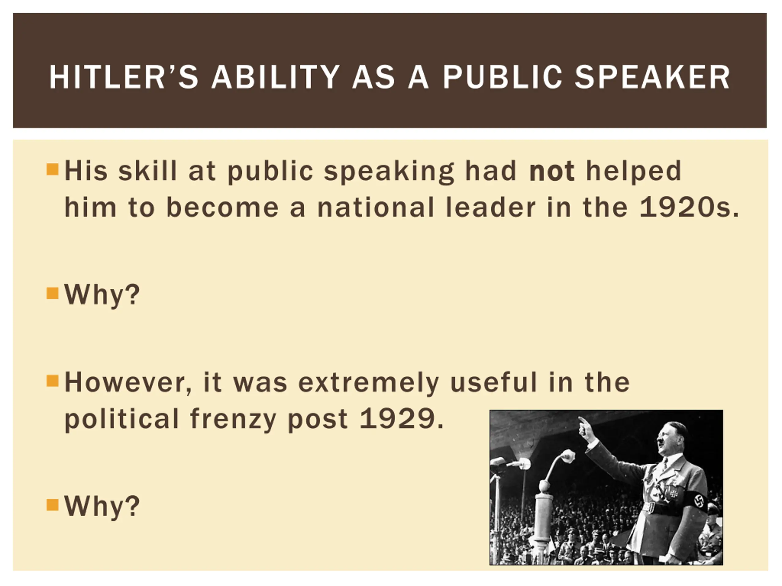 HITLERS ABILITY AS A PUBLIC SPEAKER His skill at public speaking had not him to become a national leader in the 1920s. not helped Why? However, it was extremely useful in the political frenzy post 1929. Why?