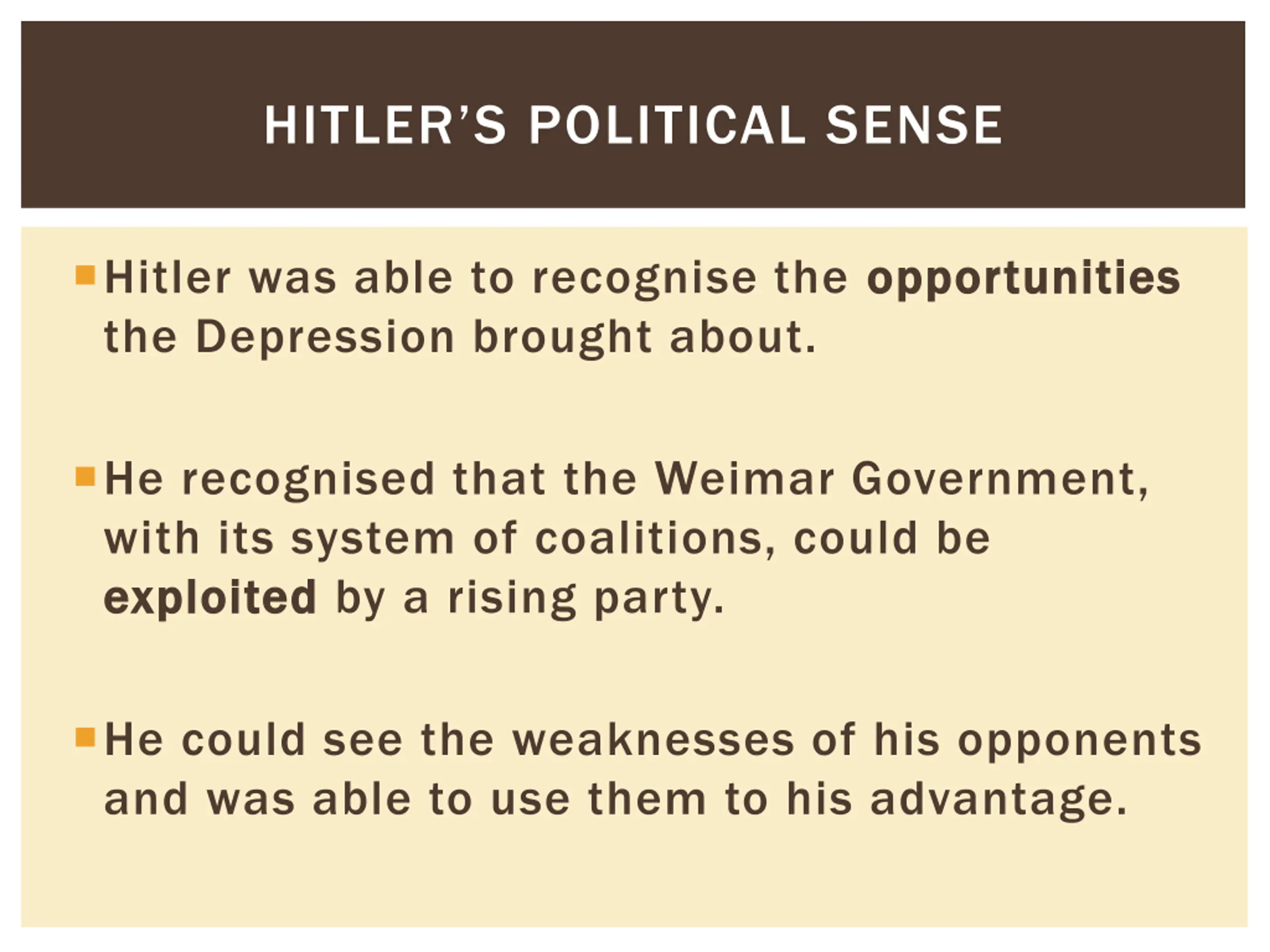 HITLERS POLITICAL SENSE Hitler was able to recognise the opportunities the Depression brought about. opportunities He recognised that the Weimar Government, with its system of coalitions, could be exploited exploited by a rising party. He could see the weaknesses of his opponents and was able to use them to his advantage.