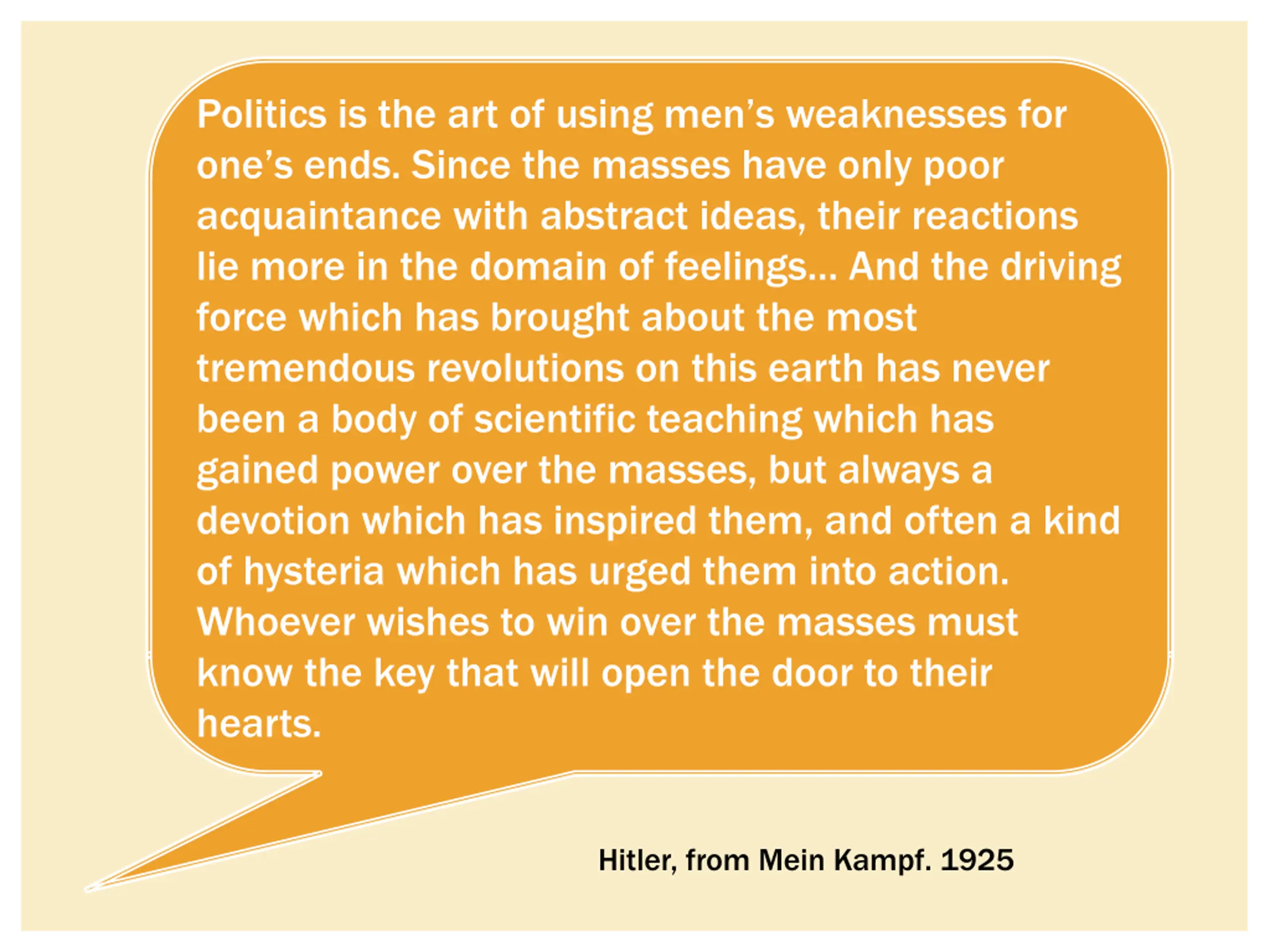 Politics is the art of using mens weaknesses for one s ends. Since the masses have only poor acquaintance with abstract ideas, their reactions lie more in the domain of feelings And the driving force which has brought about the most tremendous revolutions on this earth has never been a body of scientific teaching which has gained power over the masses, but always a devotion which has inspired them, and often a kind of hysteria which has urged them into action. Whoever wishes to win over the masses must know the key that will open the door to their hearts. Hitler, from Mein Kampf. 1925