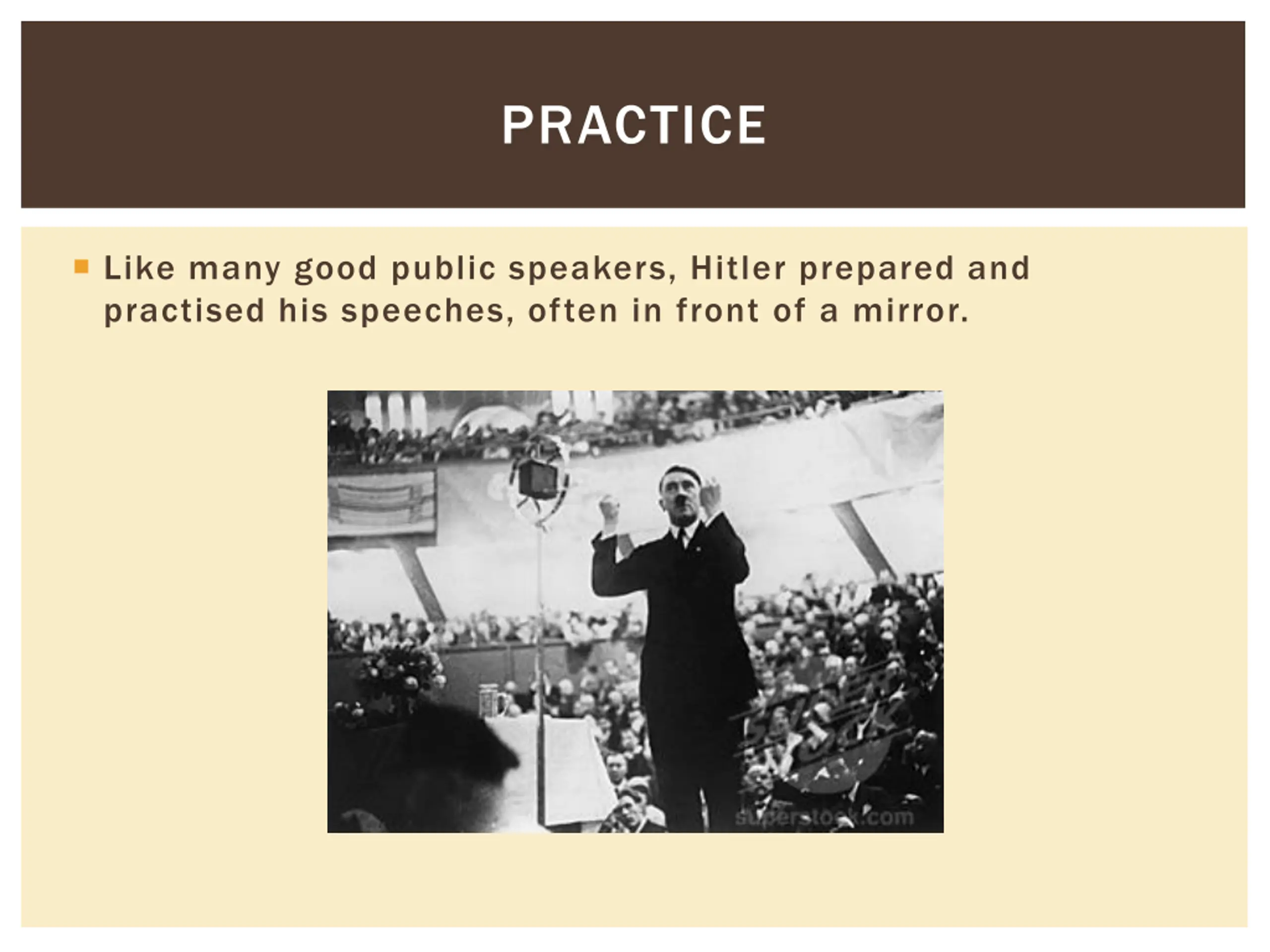 PRACTICE Like many good public speakers, Hitler prepared and practised his speeches, often in front of a mirror.