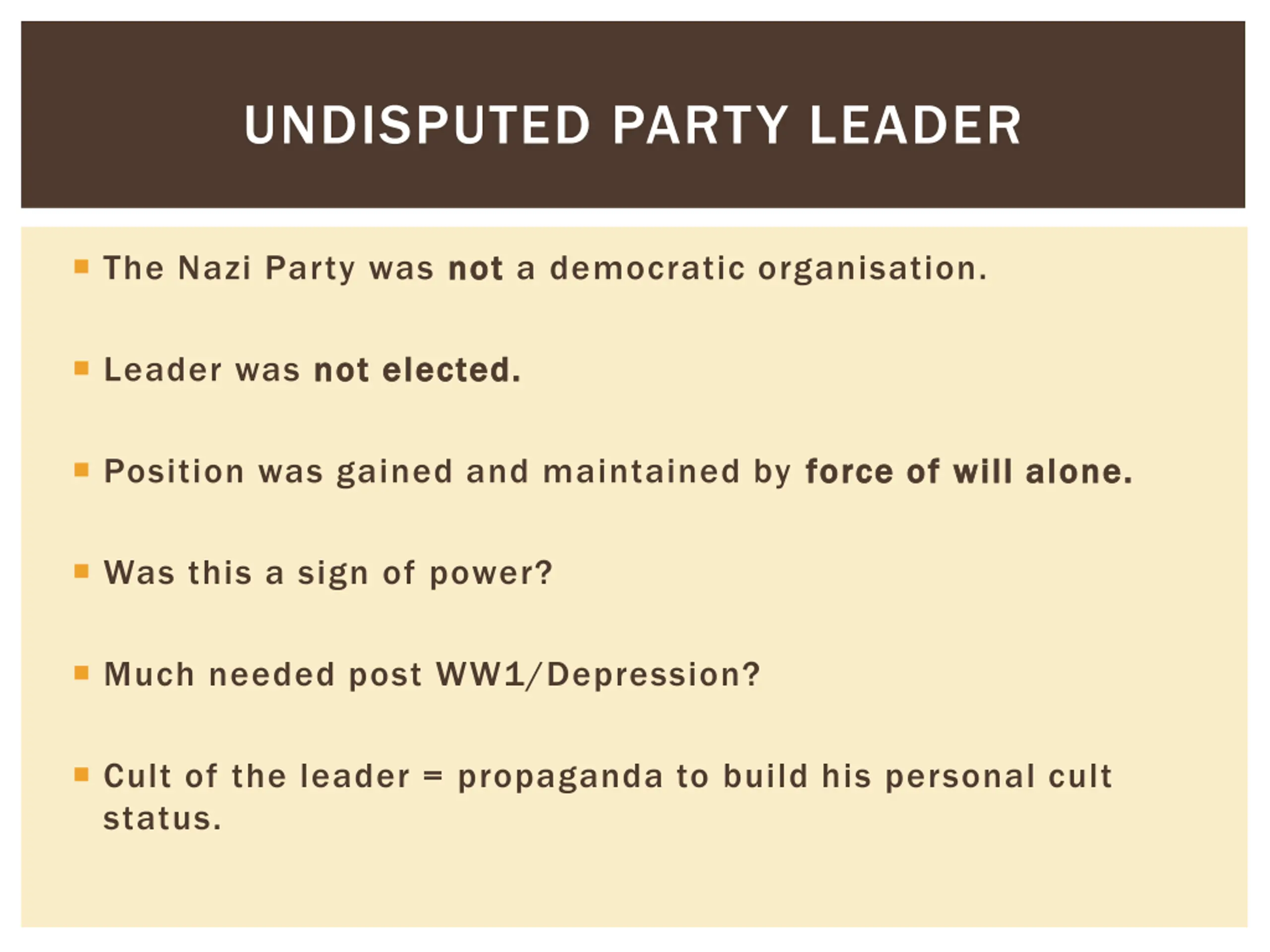 UNDISPUTED PARTY LEADER The Nazi Party was not not a democratic organisation. Leader was not elected. not elected. Position was gained and maintained by force of will alone. force of will alone. Was this a sign of power? Much needed post WW1/Depression? Cult of the leader = propaganda to build his personal cult status.