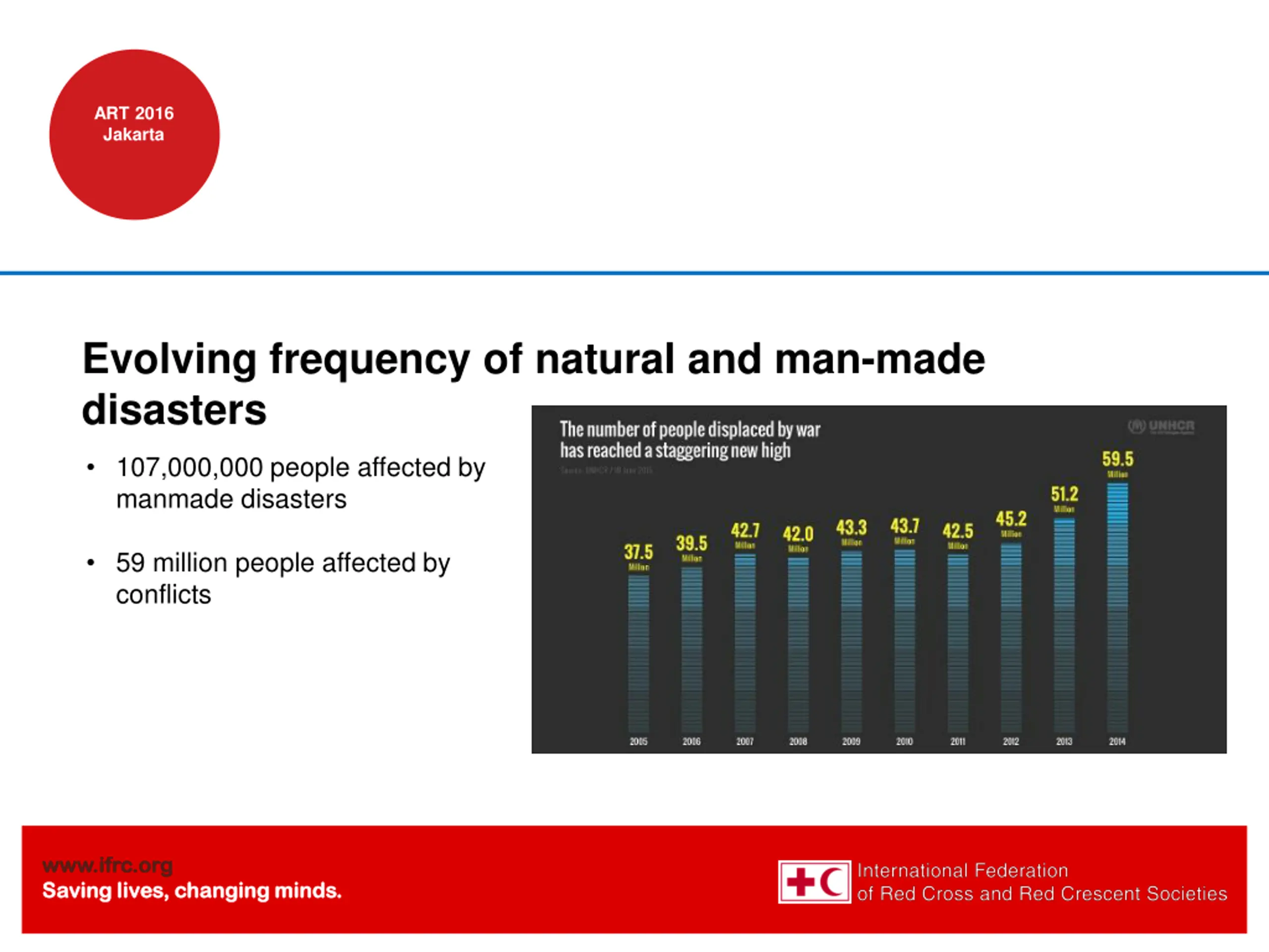 ART 2016 Jakarta Evolving frequency of natural and man-made disasters 107,000,000 people affected by manmade disasters 59 million people affected by conflicts www.ifrc.org www.ifrc.org Saving lives, changing minds. Saving lives, changing minds.