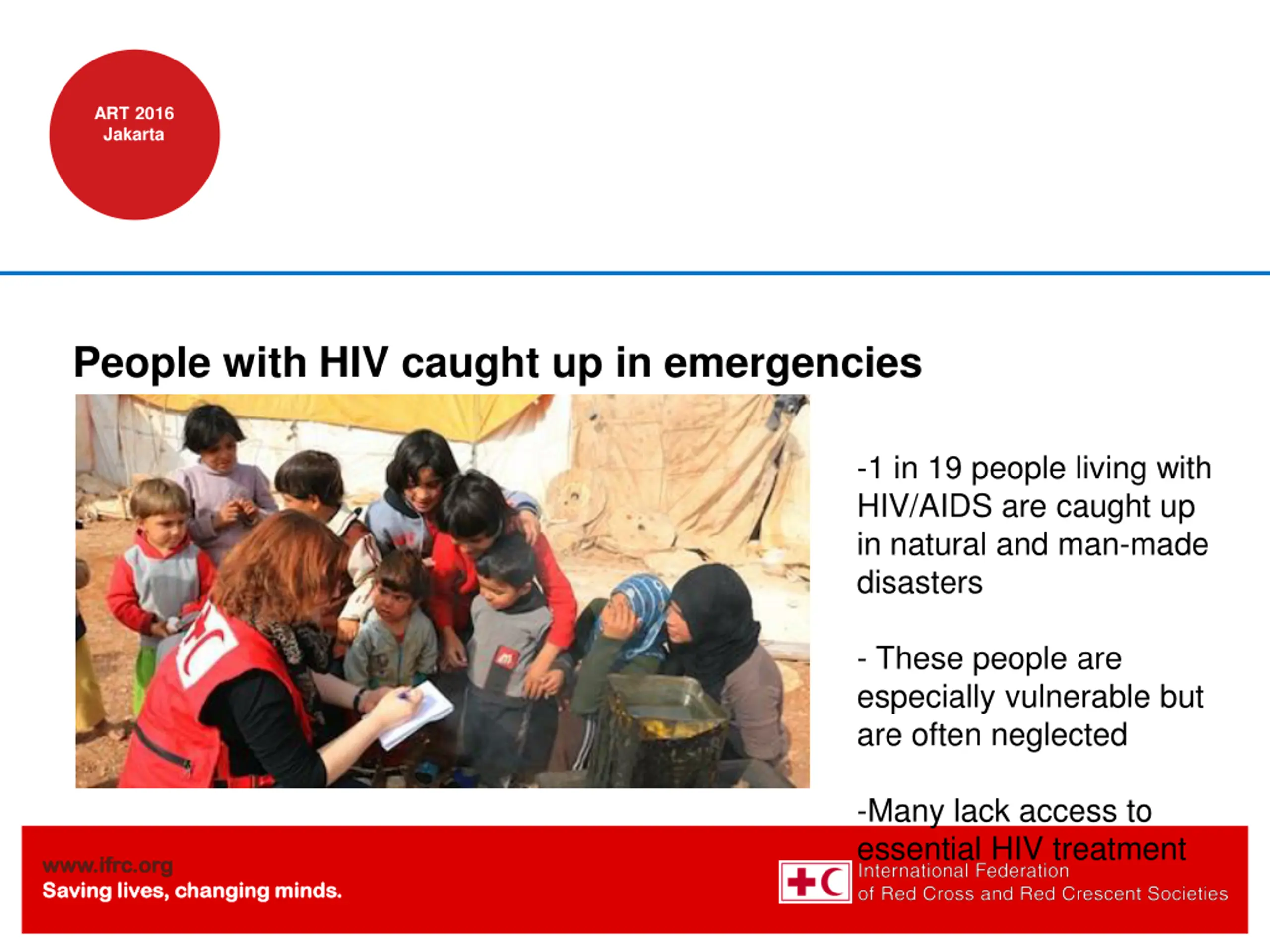 ART 2016 Jakarta People with HIV caught up in emergencies -1 in 19 people living with HIV/AIDS are caught up in natural and man-made disasters - These people are especially vulnerable but are often neglected -Many lack access to essential HIV treatment www.ifrc.org www.ifrc.org Saving lives, changing minds. Saving lives, changing minds.