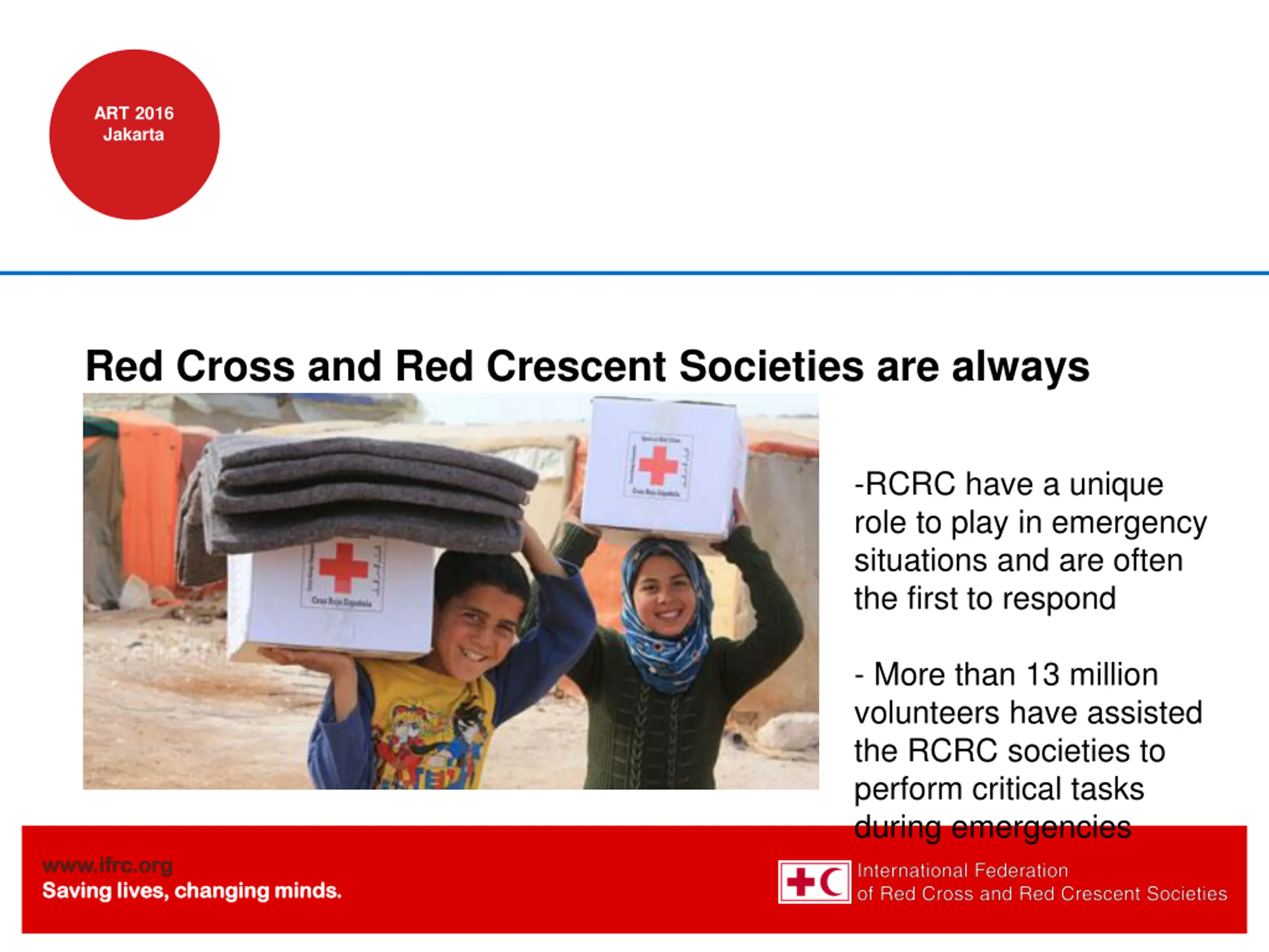 ART 2016 Jakarta Red Cross and Red Crescent Societies are always present -RCRC have a unique role to play in emergency situations and are often the first to respond - More than 13 million volunteers have assisted the RCRC societies to perform critical tasks during emergencies www.ifrc.org www.ifrc.org Saving lives, changing minds. Saving lives, changing minds.