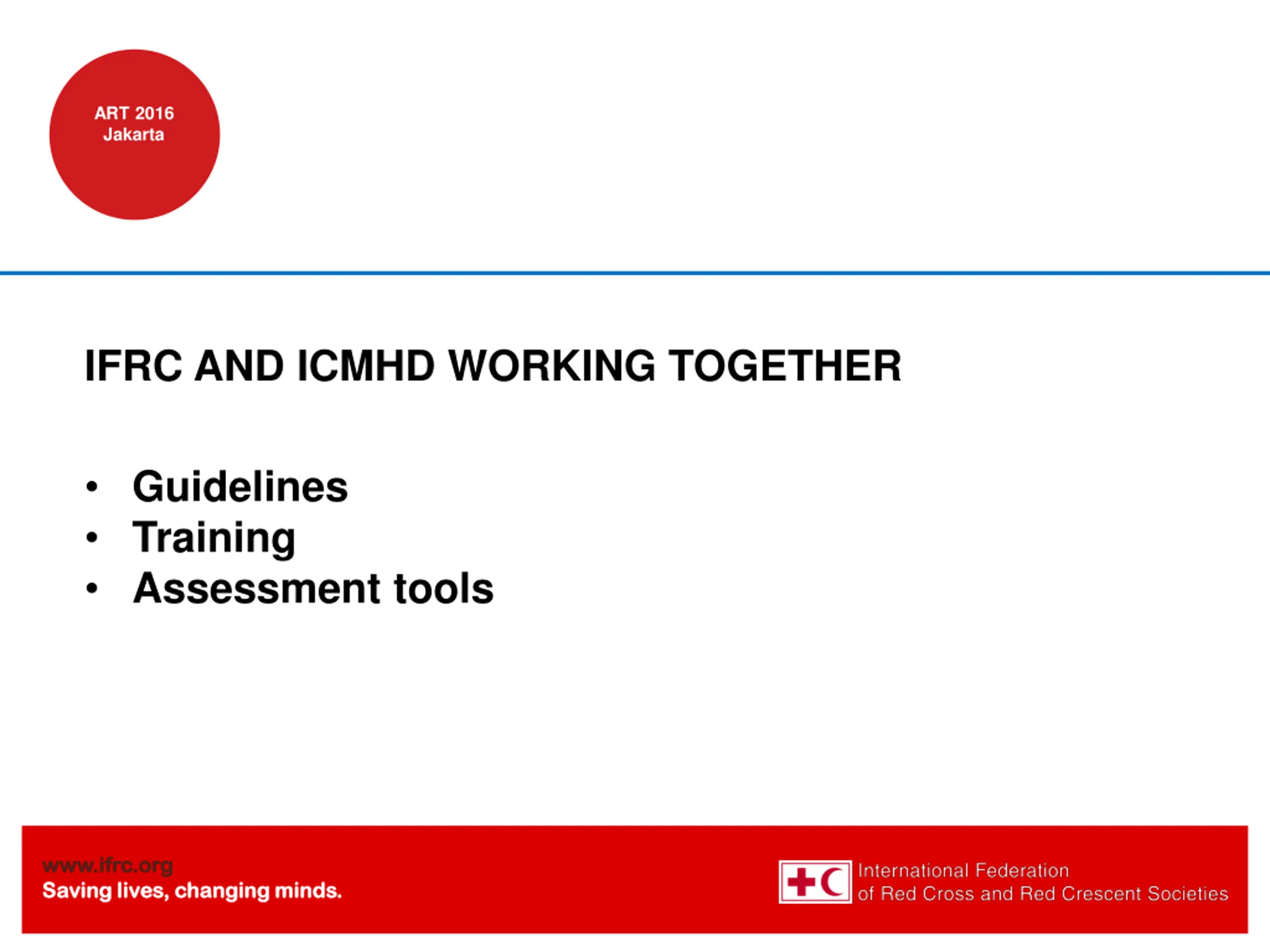 ART 2016 Jakarta IFRC AND ICMHD WORKING TOGETHER Guidelines Training Assessment tools www.ifrc.org www.ifrc.org Saving lives, changing minds. Saving lives, changing minds.